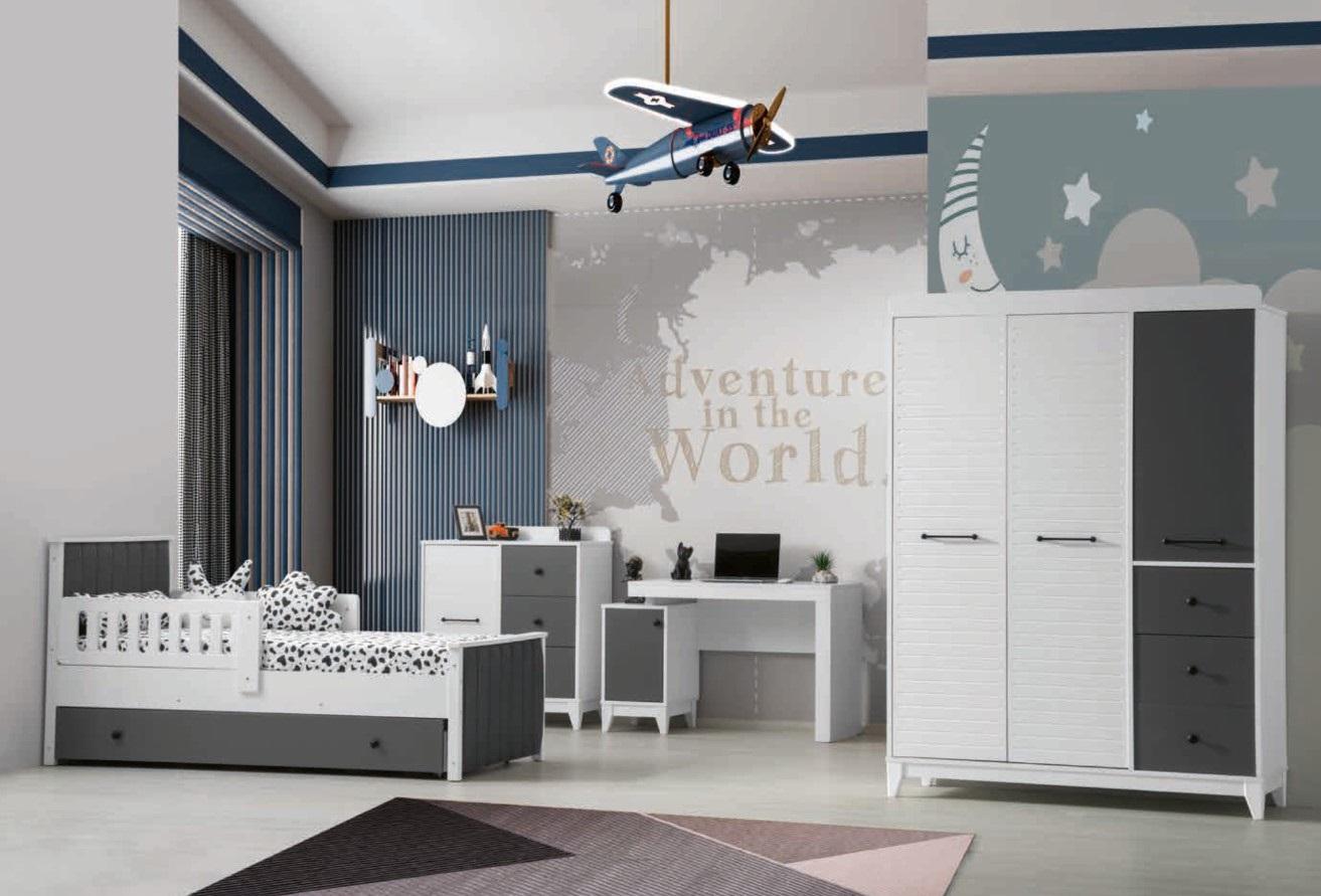 Dësen Set erlaabt et de Kanner, hire Raum op eng intelligent an organiséiert Manéier ze notzen. D'Bett mat enger Schloffläch vun 90 x 190 cm bitt genuch Platz fir e comfortable Schlof. De gut durchduechte Kleederschaaf mat sengen Dimensiounen vun 135 x 48 x 197 cm gëtt de Raum fir eng uerdentlech Verstauung vun Kleeder an Accessoiren. D'Kommode mat 94 x 47 x 115 cm ass ideal fir méi perséinlech Saachen an Dekoratiounsartikelen ze placéieren. Schlussendlech ass den Schreibtisch mat senge Moossen vu 125 x 58 x 78 cm perfekt fir de kreative Workflow vun Ärem Kand ze ënnerstëtzen. Dësen alles-ëmfaassenden Set ass geduecht fir d'Ufuerderunge vu modernen Kanner an Elteren ze treffen.