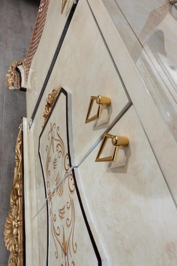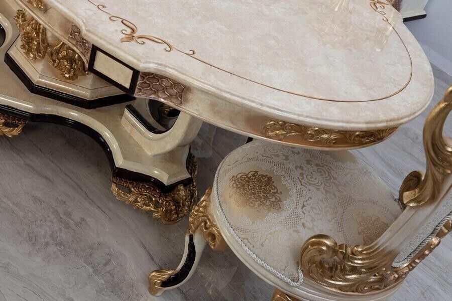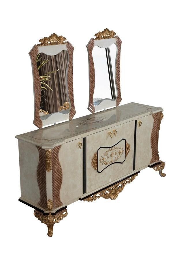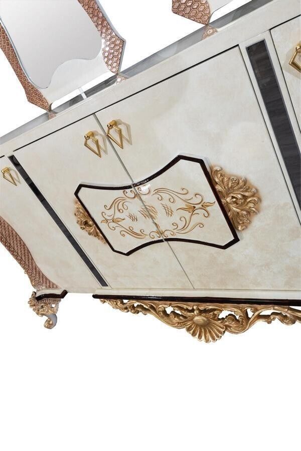 Luxus Iesszëmmer Set 9 Stéck Iessdësch + 6x Stull + Kommodë mat Spigel wäiss Neit