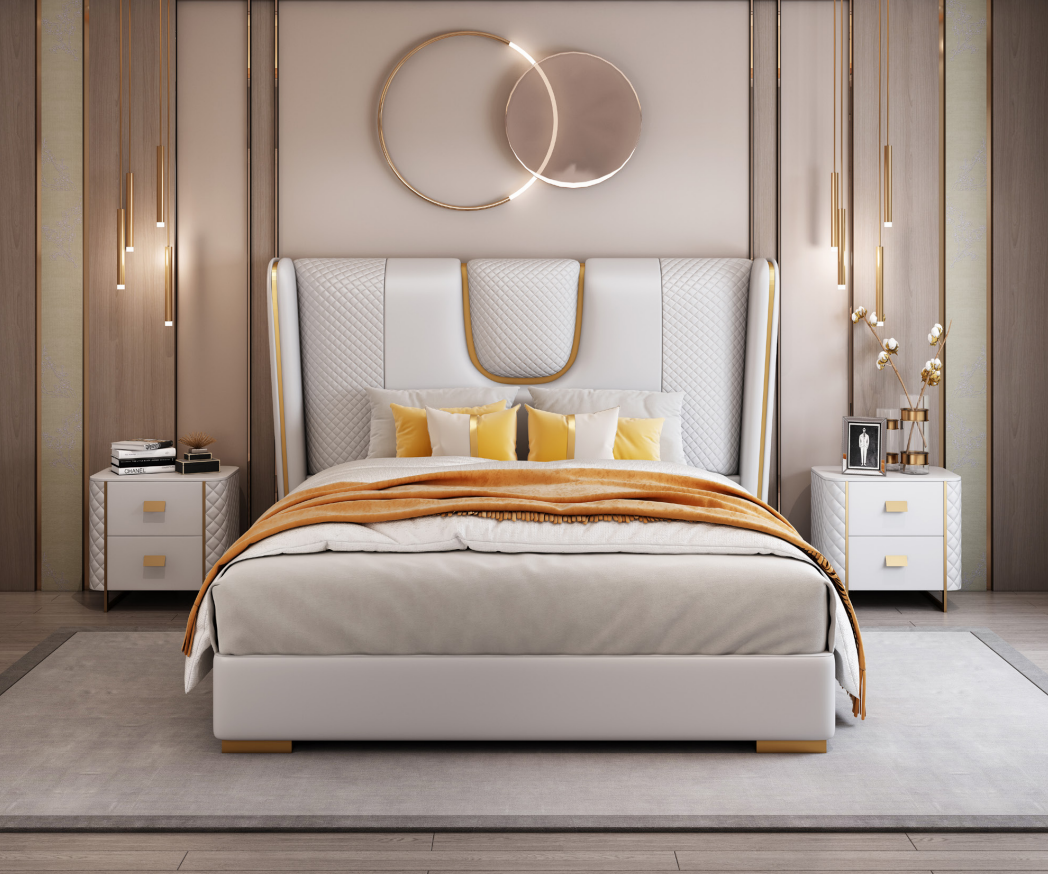 Ob Dir Äert Schlofzëmmer nei dekoréiere wëllt oder einfach Äert aalt Bett duerch e luxuriéist Modell ersetze wëllt, dëst Luxus Schlofzëmmer Duebelbett ass déi perfekt Wiel. Et ass net nëmme fir privat Schlofzëmmeren optimal, mee och eng exzellent Optioun fir Gäschtzëmmeren an Boutique-Hoteller, déi e räiche Komfort hire Gäscht bidde wëllen. D'grouss Bettfläch ass ideal fir Koppelen, déi genuch Raum beim Schlofen wëllen, a garantéiert eng ongestéiert Nuecht Erhuelung. Mat sengem raffinéierte Design, ass dëst Bett e prachtvollen Mëttelpunkt, deen natierlech mat all modernen oder zäitgenësseschen Dekor harmonéiert. Entdeckt den Ënnerscheed vun engem Schlof an engem raimlechen, eleganten Ambiente mam Luxus Schlofzëmmer Duebelbett.