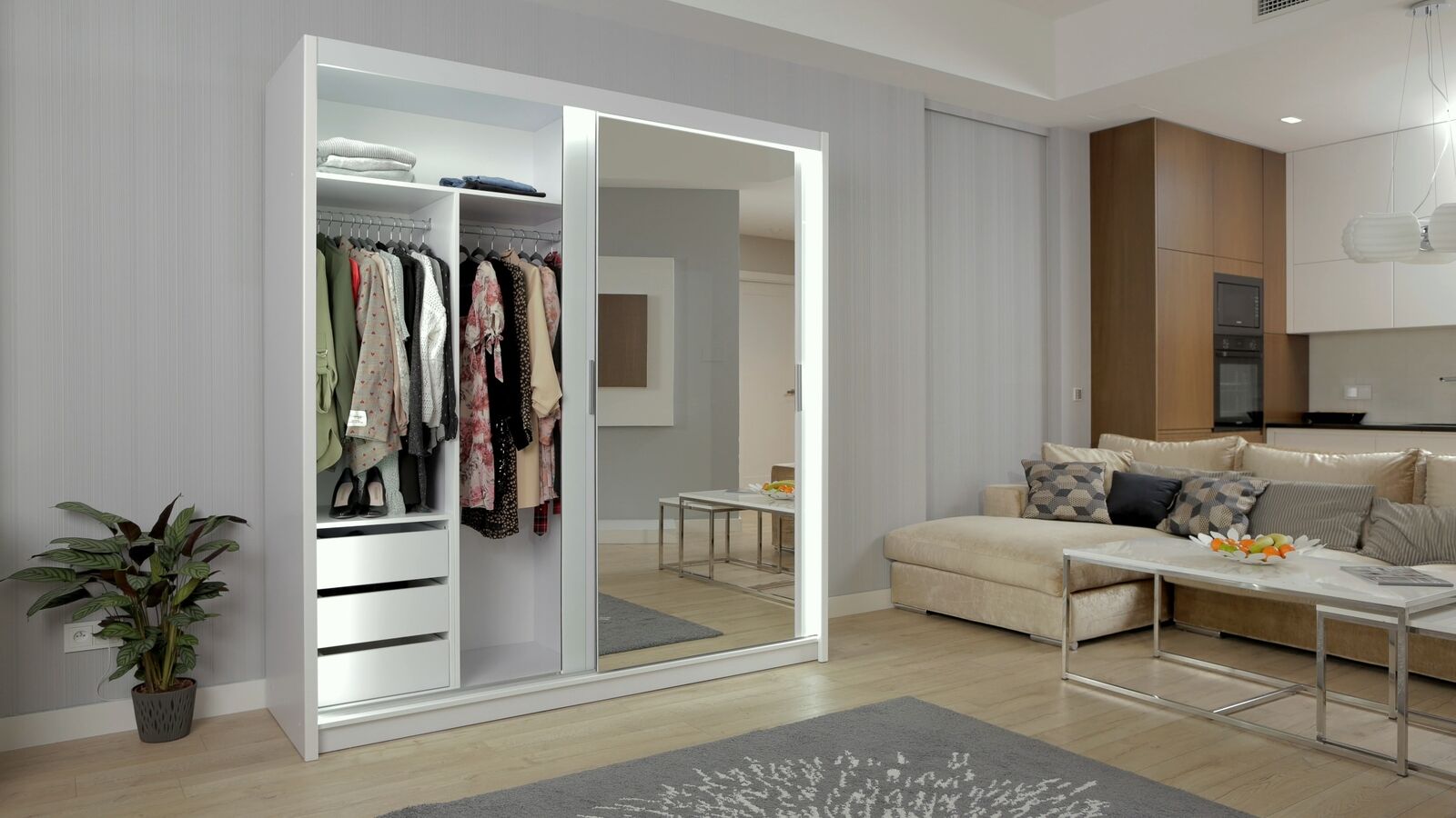 Dëse Schaf ass ideal fir déi, déi hir Plaz optimal notze wëllen, dank senger **multifunktioneller Struktur**. Kombinéiert als Kleederschaf an Regal, erlaabt et Iech Kleeder, Schong, Textilien an dekorativ Elementer op eng organiséiert Manéier ze späicheren. De minimalistesch awer elegante Design integréiert sech nahtlos an eng Vielfalt vu Wunnstiler, vun modern bis klassesch. Des Weideren kann dësen Schaf net nëmme fir de Schlofzëmmer benotzt ginn, mee och als praktesch Léisung an engem Heembüro oder Gaaschteschlofzëmmer déngen. Dëst flexibel Stéck kann och einfach nei arrangéiert ginn, fir besser op Är individuell Besoinen z'äntwerten, wat et zu enger intelligenter Investitioun fir Äert Heem mécht.