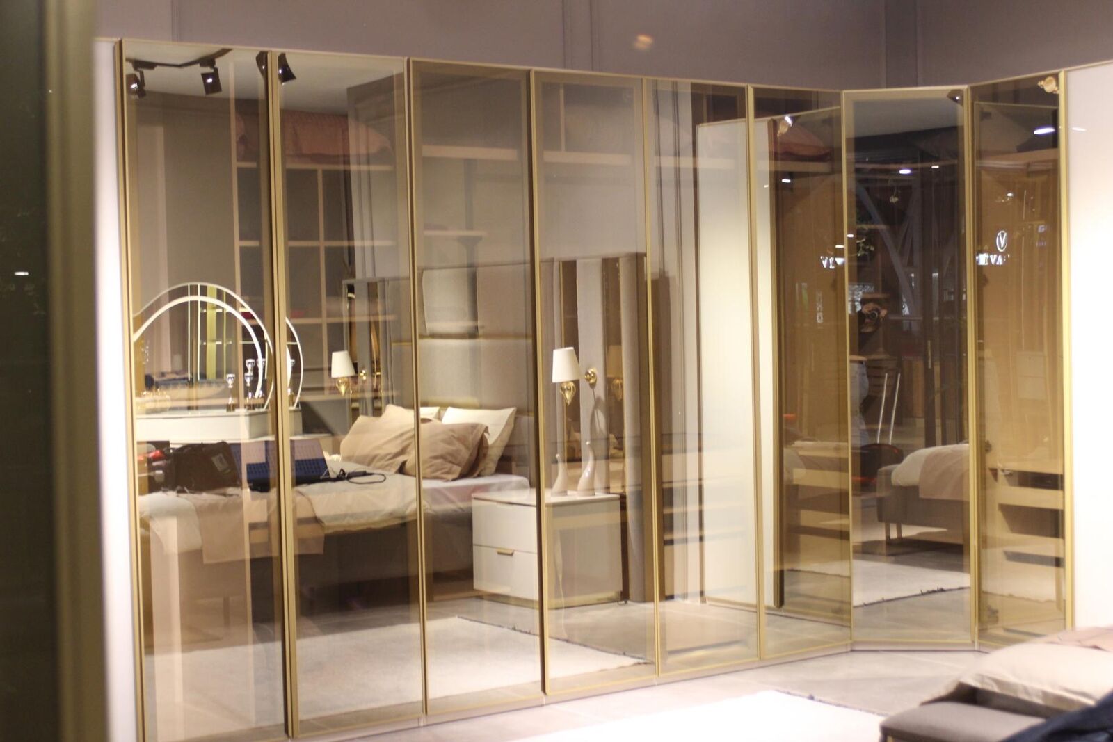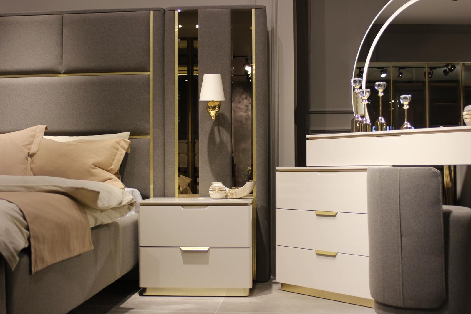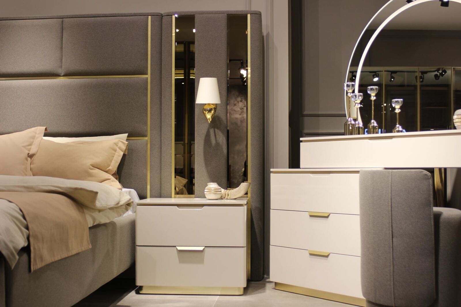 Luxus Schlofzëmmer Set, Bett, 2x Nuetsdëscher, Komoud, Kleederschaf, Holz, Neit