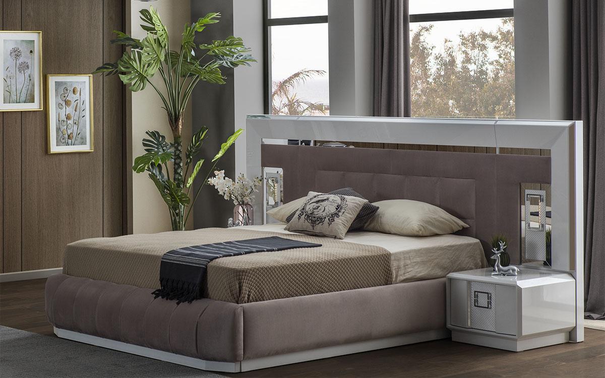 Modern Schlofzëmmer Set Bett + 2x Nuetsdëscher + Kommode mat Spigel Luxus Nei
