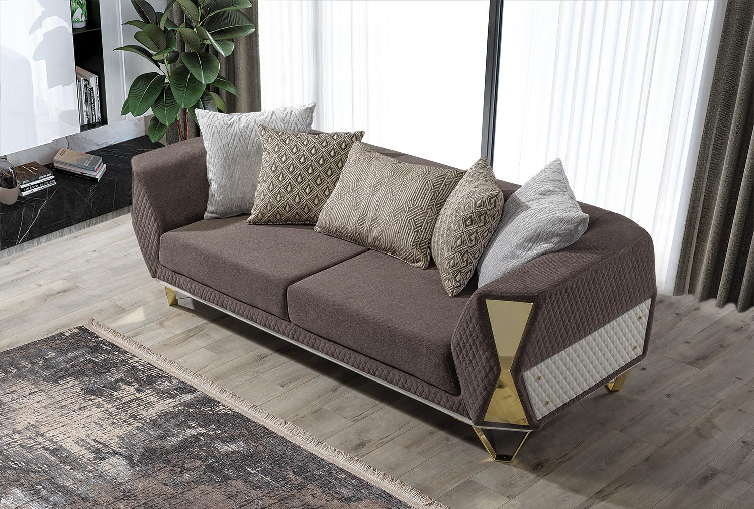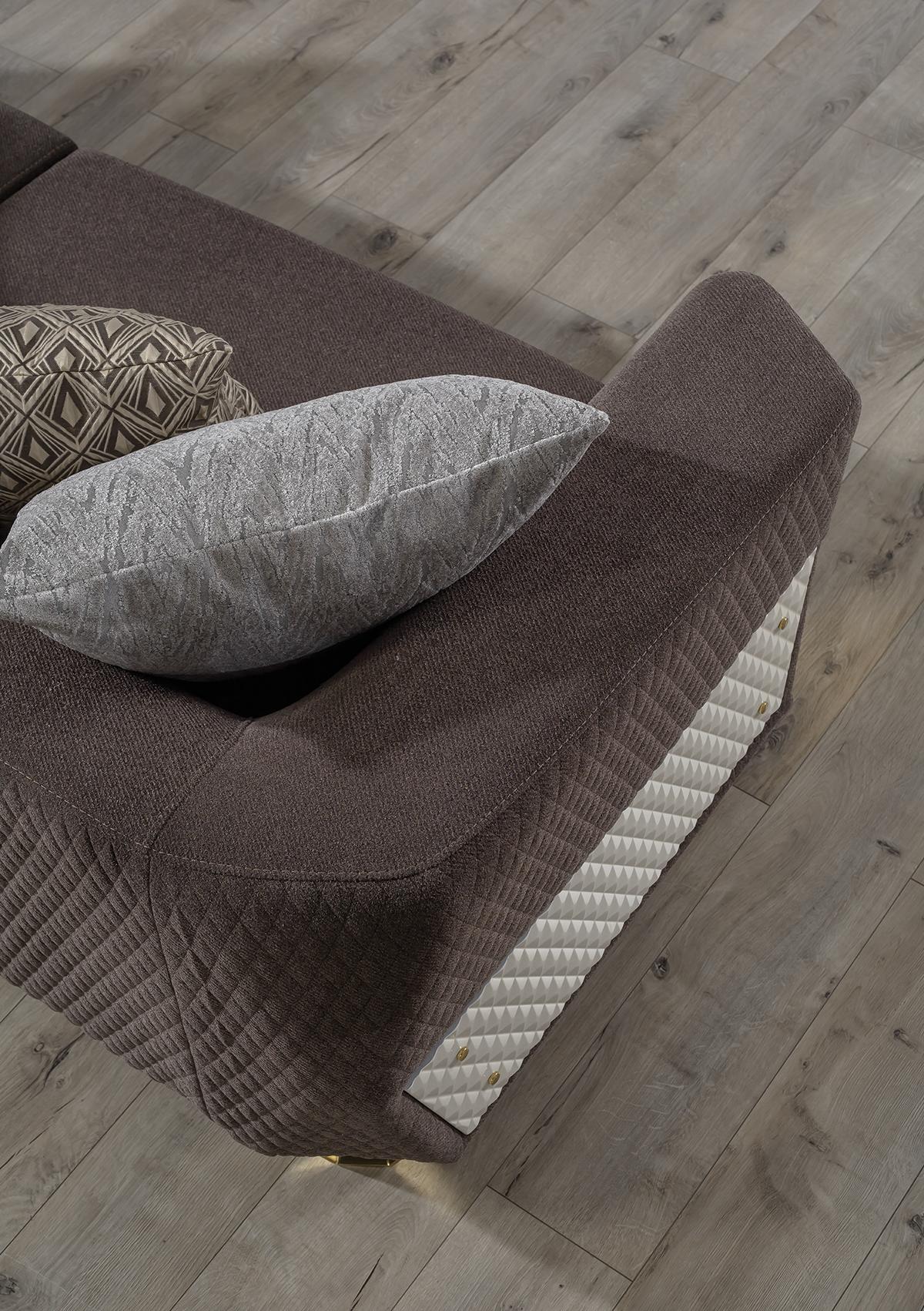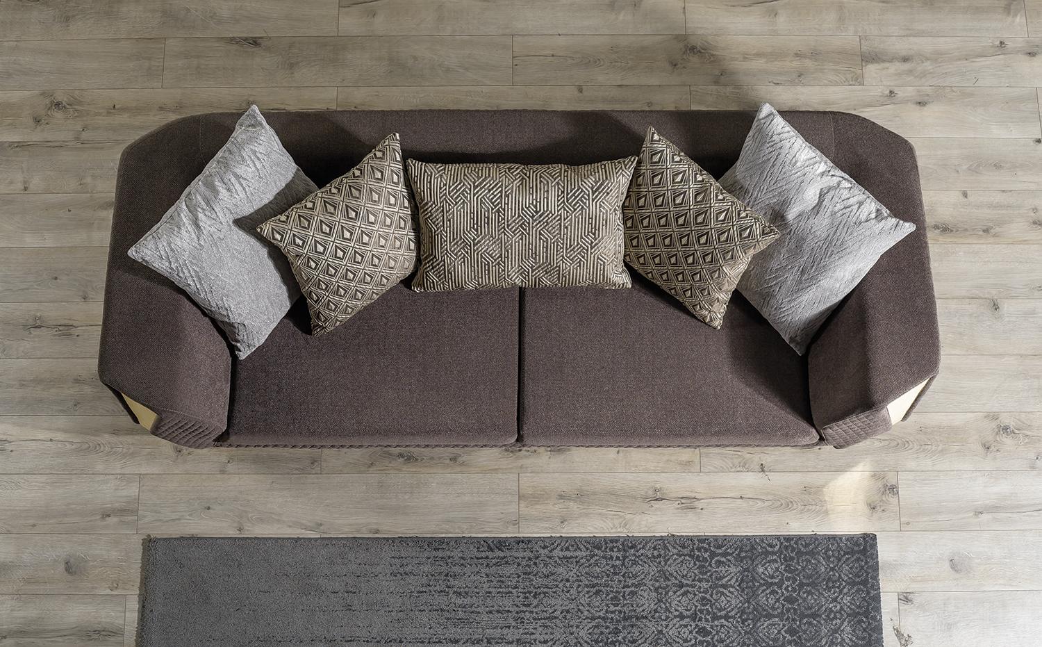 Dëse Dräisëtzer ass ideal fir all Wunnzëmmer Layout, egal ob modern oder traditionell. D'Stilvoll Textiloberfläch an de metallesche Kader vermëschen sech harmonesch fir e raffinéiert, awer zäitlose Look ze kreéieren. Dank senger universeller groer Faarf gëtt de Canapé eng ausgestrahlt Eleganz a passt nahtlos an all Dekor. Stellt Iech vir, dëse Canapé an ärem Lieblingsraum opzebauen, fir erhuelsam Momenter beim Liesen vun engem Buch oder geselleger Zeit mat Frënn a Famill ze verbréngen. Mat senge robuste Materialien an elegante Design ass dëse Canapé eng Investitioun an Qualitéit a Stil, déi sécher vill Joren hällt.