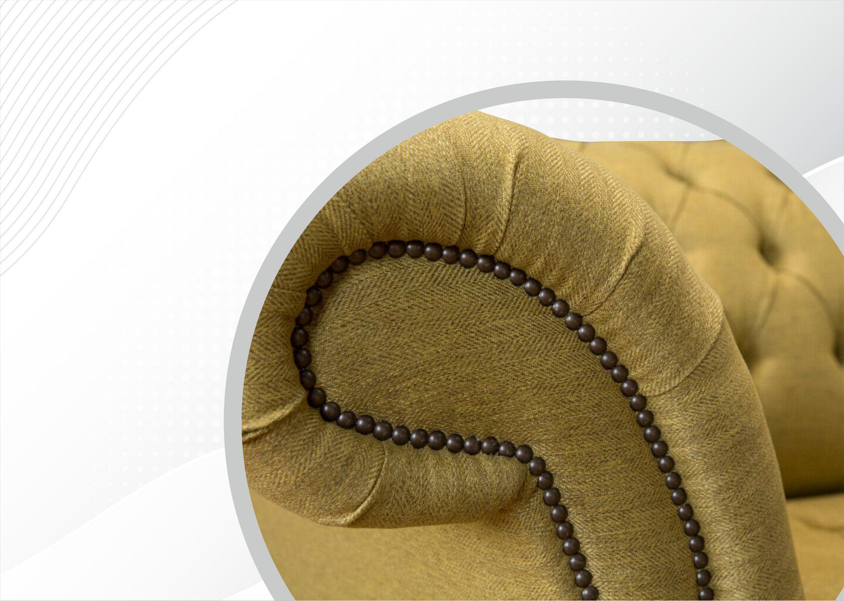 Den 'Chesterfield 3-Sëtz Giel Wunnzëmmer Design Couchen Polstersofa Sofas Textil' ass eng herausragend Ergänzung fir all modern Wunnzëmmer. Mat enger käschtegeformter Längt vun 225 cm an enger Héicht vun 79 cm, bitt dëst Sofa genuch Raum fir Komfort a Stil. De luxuriéise Textilmaterial suergt fir en angenehmen a weichen Touch, perfekte fir entspaant Owender. D'Sëtzhéicht vun 42 cm an d'Sëtzdéift vun 55 cm garantéieren en optimale Sëtzkécomfort fir Famillen a Gäscht.