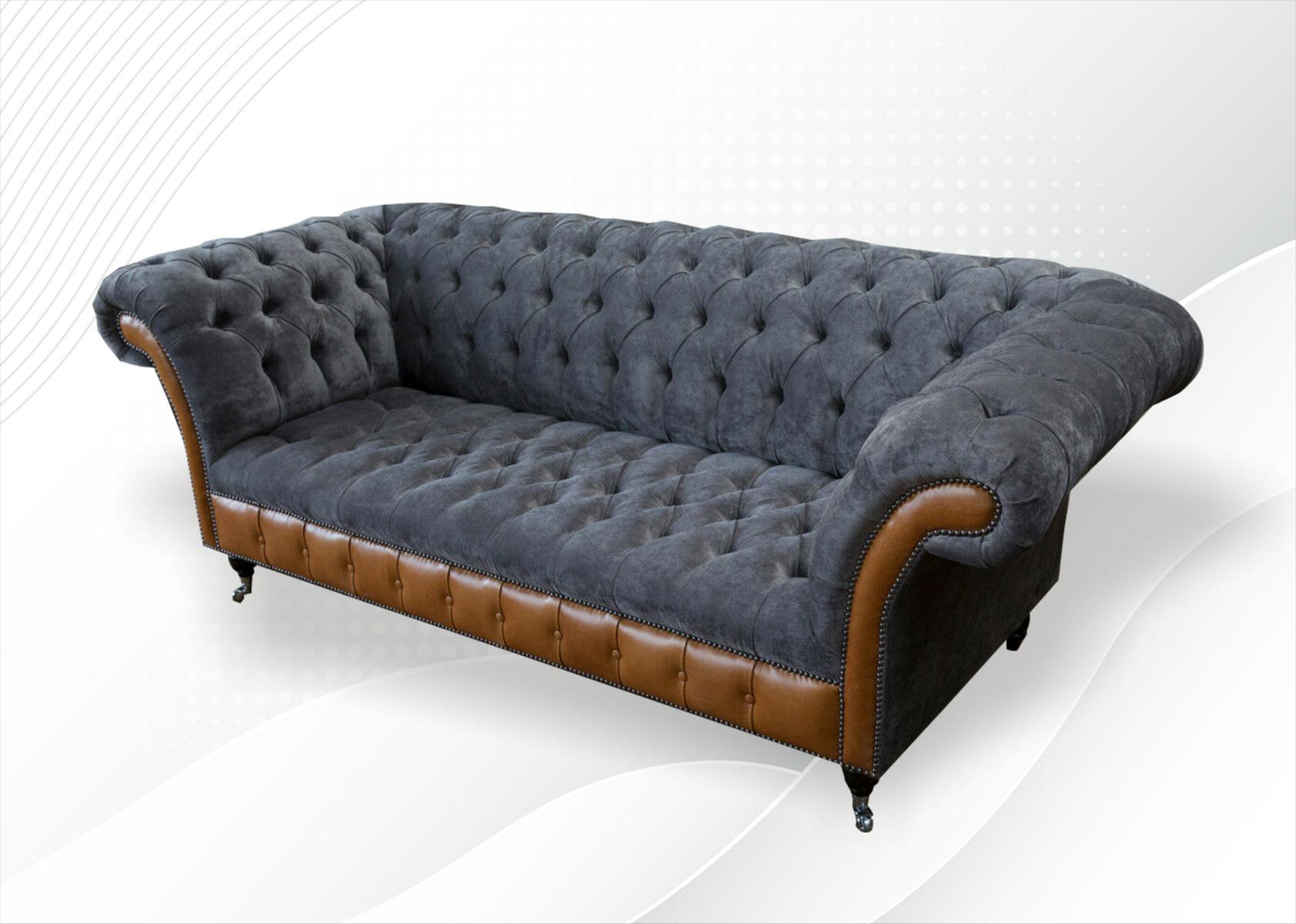 Chesterfield Sofa Couch Polster 3 Sëtzer Gro Textil Stoff Gri Couchen
