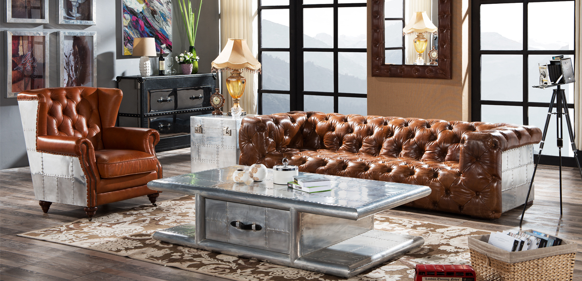 Ledersofa Sofa 3 Sëtz Vintage Lieder Miwwelen Dräisëtzer Canapé Aluminium Canapéen