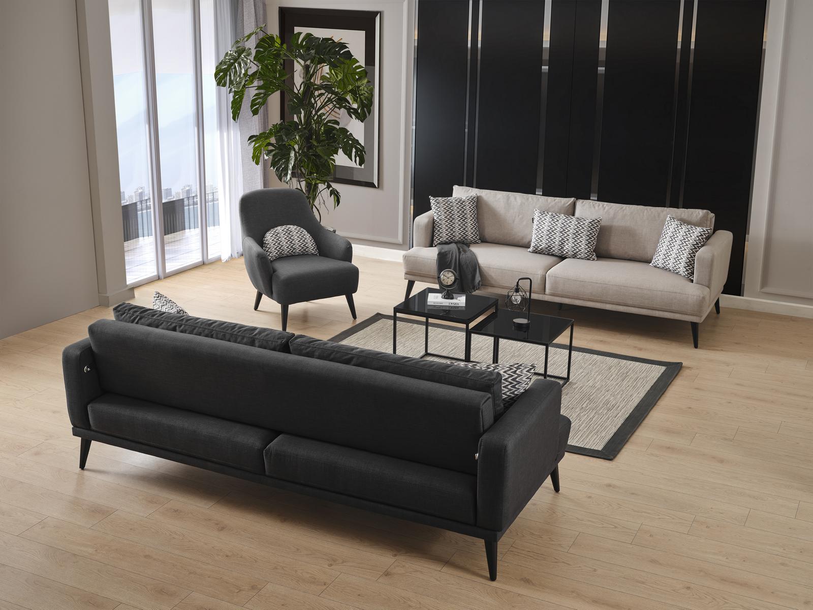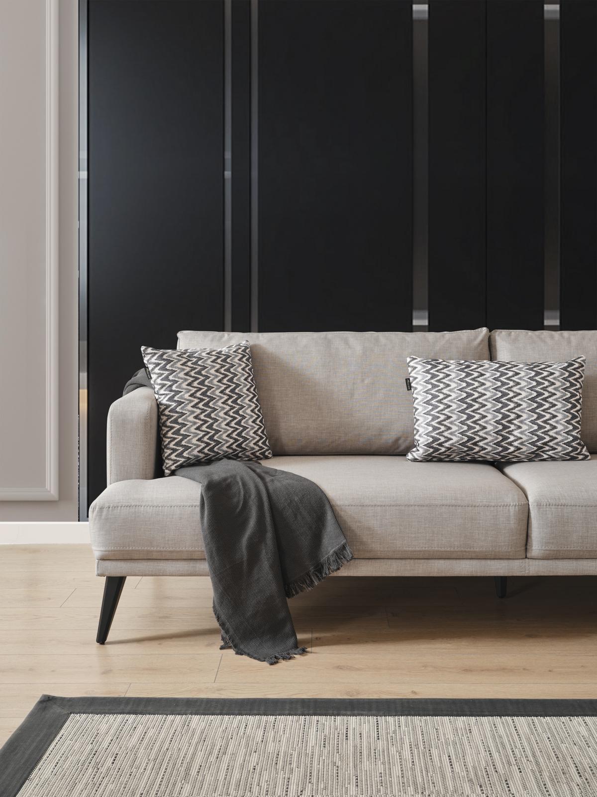 Dräisëtzer Stoff Sofa Beige modern Design Wunnzëmmer.