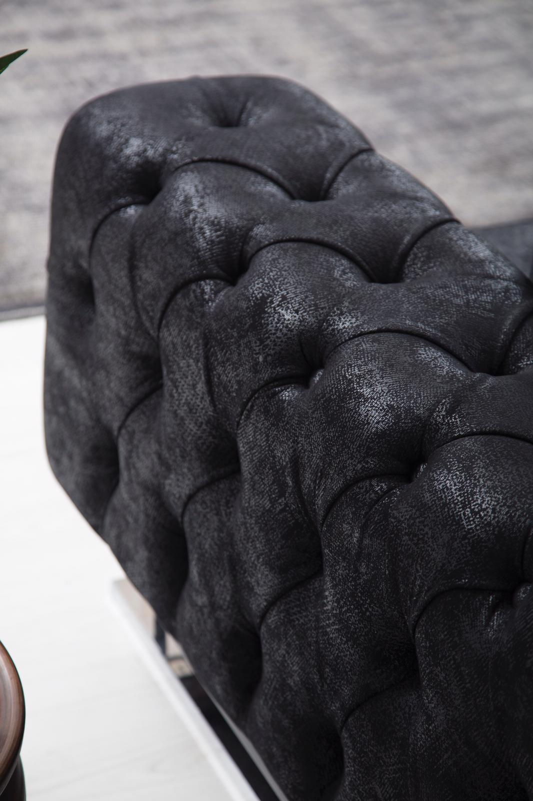 Ideal fir all Persoun déi e luxuriéise Gefill an hirem Zuhause wëllt hunn, kann dës Chesterfield Sofagarnitur eng Kraaftaktioun am Liewensraum sinn an eng perfekt Ergänzung fir all Stille sinn, vun traditionell bis modern. Déi subtil, wéi ofgebilde Faarf méiglechkt et, d'Couch nahtlos a verschidde Interieurdecoren ze integréieren. D'Uwendungsméiglechkeete si villfälteg; ob et fir e gemittlechen Owend mat Frënn oder e rouege Moment eleng ass, dëst Stéck versprécht Immersion a Komfort. Kombinéiere se et mat gemittleche Këssen oder enger waarmer Decken fir déi perfekt Relax-Oase an Ärem Heem ze kreéieren.