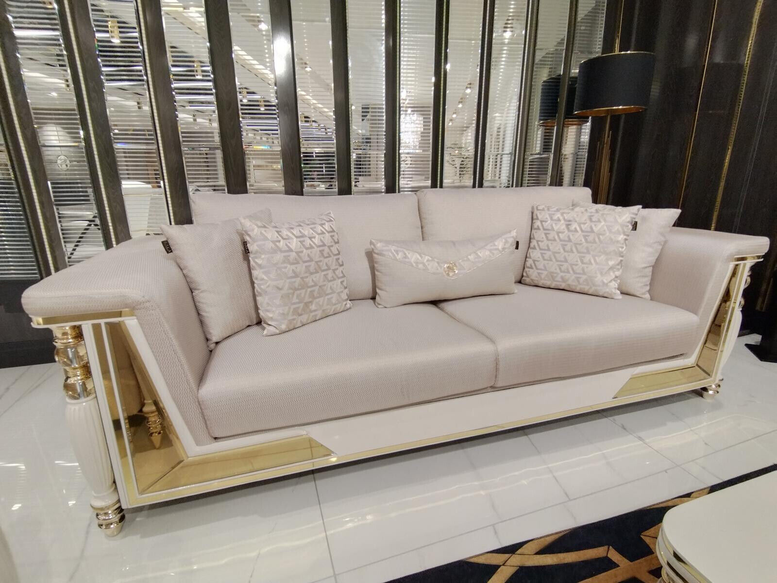 Entdeckt de luxuriéise Komfort mam Sofa Dräisëtzer Polster 3 Sëtzer Sofas Design Luxus Miwwelen Textil Couchen Nei. Dës elegant entworfene Couch, mat sengen Abmessungen vun ca. 234 x 96 x 72 cm, ass perfekt fir Är Wunnzëmmer opzepeppen. Mat senger raffinéiert Design, bidd dësen Dräisëtzer net nëmmen genuch Plaz fir d'ganz Famill, mee och en estheteschen Highlight fir Ären Interieur. Geméit aus héichwäertegem Holz a faarweg ugeholl wéi ofgebilt, passt dës raffinéiert Couch perfekt an all dekorativen Stil, vun traditionell bis modern.