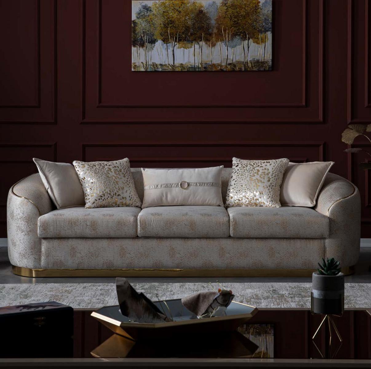 De 'Luxus Canapé oval Dräisëtzer Hotel Empfang Ariichtung Miwwelen 247cm' ass déi perfekt Ergänzung fir e raffinéiert Ëmfeld. Desen exklusive Dräisëtzer erlaabt Iech a Stil an Komfort ze entspanen, dank senger imposanter Längt vun 247 cm a suergfälteg designten Héicht vu 76 cm. Mat enger Breedt vun 97 cm bitt dësen Canapé genuch Plaz fir méi Gäscht, wärend déi bequem Sëtzhéicht vu 44 cm an eng Sëtztiefe vu 54 cm optimal Ënnerstëtzung fir Stonnen laang Komfort garantéieren. D'Materialkombinatioun aus Holz an Textil gëtt der Ariichtung e modernen an elegante Look, an d'Innengestell aus richtegem Holz versprécht Robustheet an Langleefegkeet.