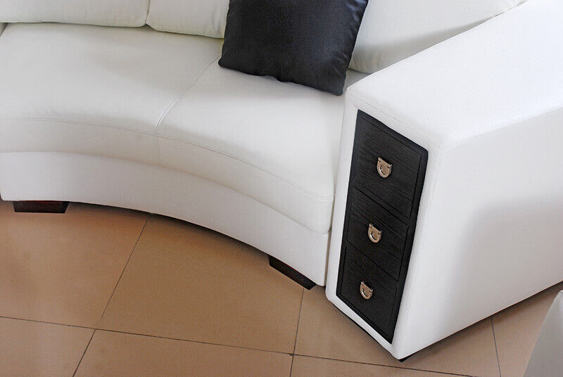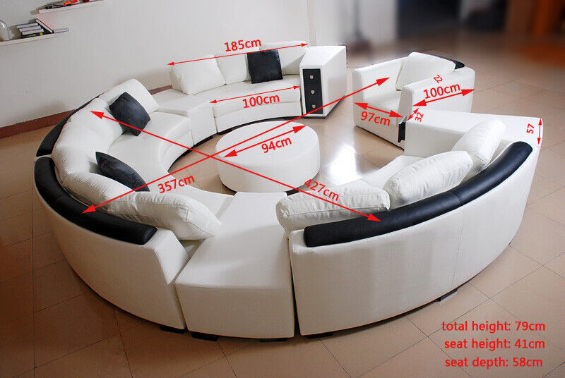 Erhief d'Ästhetik vun Ärem Wunnberäich mat der Wunnlandschaft Ronn Ecksofa Lieder Ronn Couch Garnitur Sofa Couch Eck, e Meeschterstéck vun Handwierk a Komfort. Mat enger beandrockender Dimensioun vu 357 x 427 x 185 cm oder 185 x 427 x 357 cm, a säitlecher Hocker-Dimensioun vun 94 x 94 cm, bidd dëst raffinéiert Sofa genuch Plaz fir all Är Gäscht. D'Sëtzflächen, de Réckelen an d'bannen Säite vun den Aarmleenen si mat engem Premium Liederfaserstoff (70% Lieder / 30% Polyester) bedeckt, wahrscheinlech an Ärer gewielter Faarf oder op Ufro och an anere Faarwen. Déi geraimeg Sëtzdéift vun 58 cm a Sëtz Héicht vun 41 cm garantéieren e luxuriéise Komfort, ënnerstëtzt vun engem Innengestell aus echtem Holz, wat Zouverlässegkeet a Stabilitéit versprécht.