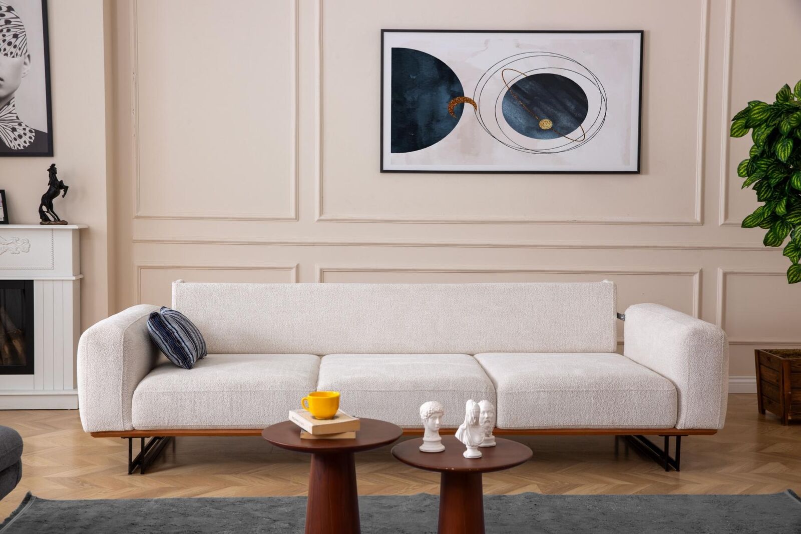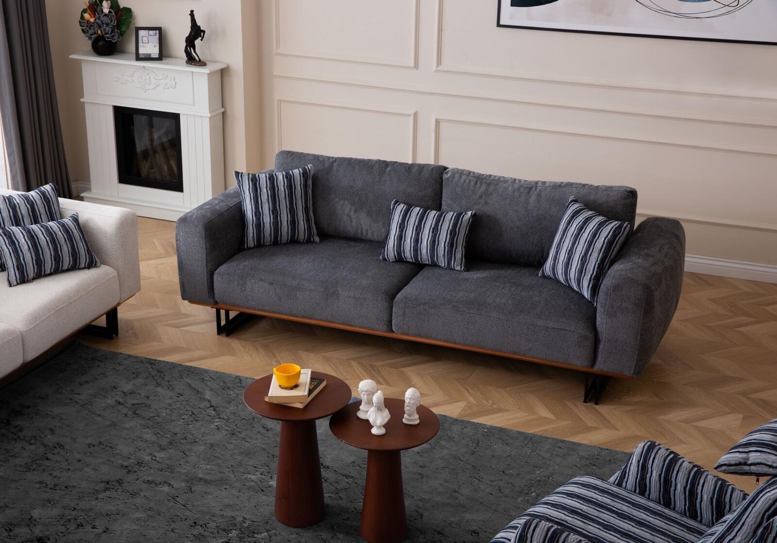 Dës hochwerteg Garnitur kombinéiert en haltbare Materialien-Mix aus Holz an Textil, wat net nëmmen eng super Ästhetik bitt, mee och dauerhaft an haltbar ass. D'Faarf vum Set, wéi ofgebilt, erméiglecht eng einfach Integratioun an all Interieur-Stil. Et ass ideal fir déi familiär Versammlung oder fir Entspanung nom laangen Dag. Ob Dir eppes liese wëllt, film kucken oder einfach relaxe wëllt, dës Sofa Garnitur bitt de perfekte Plaz. Bréngt e modernt a rafinéiert Element an Äert Heem mat dësem stilvollen a praktesche Set.