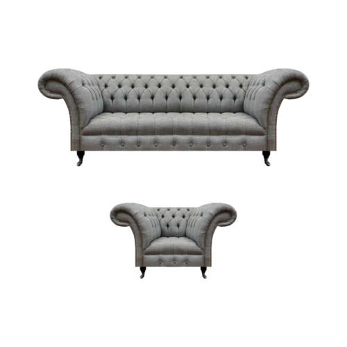 Uidder Glanz, Faarf an Textur an engem Design, deen Ären individuellen Stil erëmspiegelt, kënnt Dir aus verschiddenen luxuriéise Materialien auswielen, wéi Premium Konschtlieder, Premium Echtlieder oder Premium Samt Stoff. De 'Magic Home' Fleckenofweisend Stoff bitt eng praktesch Léisung fir Haushalt mat Klengen oder Hausdéieren. Fir nach méi Glamour kënnt Dir Kristallsteng als alternativ zu de Knäppercher bäifügen, mat Méiglechkeete wéi richteg Swarovski Kristallsteng. Egal ob et fir Relaxatioun no engem laangen Dag ass oder als Schmockstéck fir Gäscht, dës Grau dräisëtzeger Chesterfield Sofa wäert net enttäuschen.