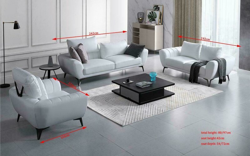 De 'Liederdivan Canapé Wunnlandschaft 3+2+1 Sëtzer Divan Garnitur Design Neit' ass déi perfekt Ergänzung fir all stylbewosst Heem. Mat sengen dräi, zwee an eent Sëtzer Optiounen, bidd dësen exquisite Couch-Set eng flexibel Sëtzméiglechkeet mat enger Gesamtmaachung vun ca. 242/192/124 cm Längt. D'Komfort ass duerch deng Sëtzdéift vun ca. 54/72 cm an engem entspaanten Sëtzhéicht vun ca. 42 cm garantéiert. Dëse Set rifft mat sengem Premium Liederfaserstoff, deen aus 70% Lieder an 30% Polyester besteet, eraus, a bréngt Eleganz an all Zëmmer. Mat der Optioun vu ville Faarfwiessel si méiglech, kënnt dir de Set un är spezifesch Dekoren ubassen.