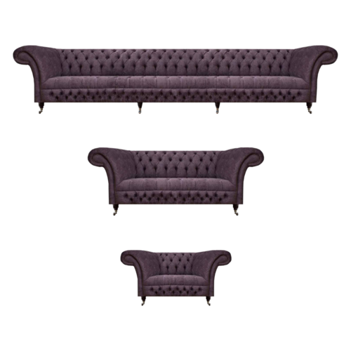 Entdeckt de Luxus Design Canapé-Set 3tlg Chesterfield an enger faszinéierender violetter Faarf, ideal fir äert Wunnzëmmer. Dëst Set besteet aus engem 4-Sëtzer Sofa vu ca. 275 x 90 x 80 cm, engem 2-Sëtzer Canapé vu ca. 180 x 90 x 80 cm, an enger stilvoller Fotell vu ca. 130 x 90 x 80 cm. Mat enger Sëtz Héicht vun ca. 42 cm an enger Sëtzdéift vun ca. 52 cm bitt dës Kombinatioun exzellent Komfort. D'Innenstruktur ass aus héichqualitativem Holz konstruéiert, begleet vun engem Federkär fir optimal Ënnerstëtzung an Haltbarkeet. De luxuriéise Look gëtt durch d'Realisatioun an Premium Konschtlieder, Echtlieder, Samt Stoff oder Magic Home Stoff (fleckenofweisend) ënnerstrach, jee no ärem Goût an Ästhetik. Fir en nach méi exklusiven Touch kënnt Dir tëschent normale Knäppercher oder Kristallsteng, inklusiv Echte Swarovski Kristallsteng, wielen.
