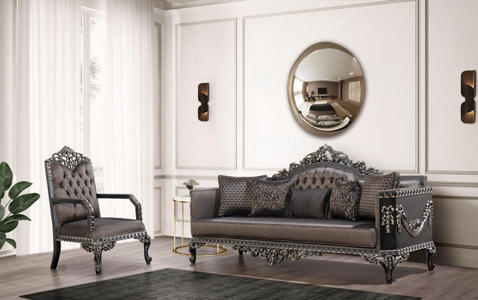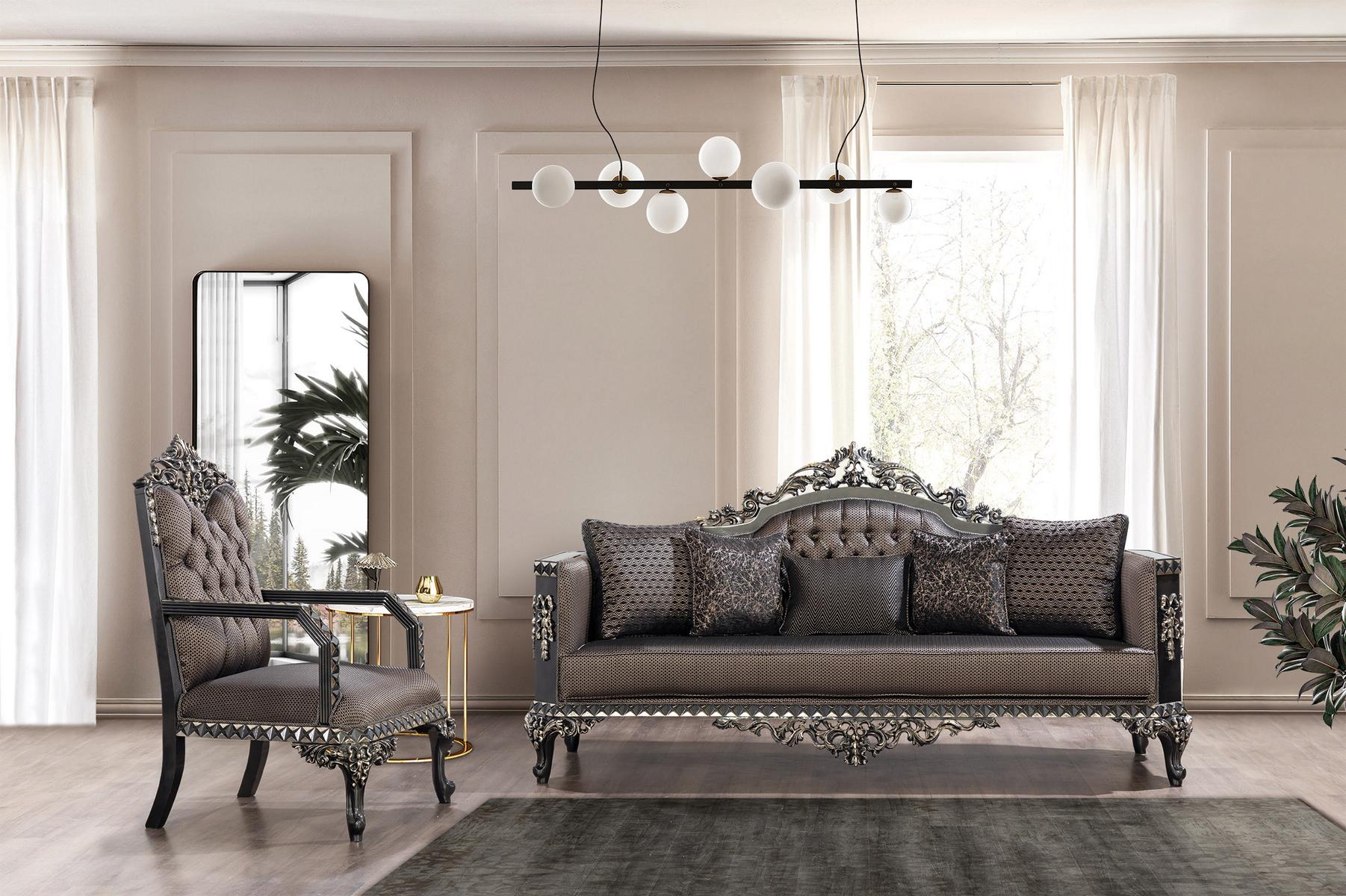 Erféiert Iech un dem imperialen Stil mat der Luxus Chesterfield Sofagarnitur 3+1 Sëtzer Klassesch Sofa Barock Polstersëtz. Dës exklusiv Garnitur, bestehend aus engem dräisëtzigen Sofa an enger gemittlecher Fotell, verbënnt dat Bescht aus Klassik a Komfort a bréngt en Touch vu barockem Flair an Äert Wunnzëmmer. Den eleganten Design, mate Holzrahmen a geschmaache Textilstoff, suergt fir eng luxuriéis Atmosphär, déi all Interieur veredelt. Mat enger Gesamtlängt vu 230 cm fir de Sofa an 78 cm fir d'Fotell, bidde si genuch Plaz fir Gemittlechkeet an Entspanung, iwwerdeems d’strategesch Sëtz Héicht vun 46 cm an d’Sëtzdéift vu 54 cm optimal Ënnerstëtzung a Komfort garantéieren.