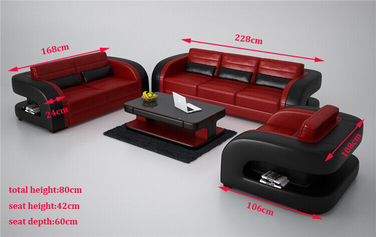 Erfuerscht déi ugebuede Gemittlechkeet an Eleganz vun eisem 'Luxuriéis Wunnzëmmer Sofasett 3+2 Sett Garnitur Lieder Polster Couchen'. Mat enger **Gréisst vu ca. 228 x 80 x 106 cm fir de 3-Sëtzer** an **ca. 168 x 80 x 106 cm fir de 2-Sëtzer**, passt dës Garnitur souwuel a grouss wéi a kleng Wunnraim. Déi **fräi wählbar Faarwoptioune beschwéieren** Iech e maximal individualiséierten Look, deen all Interieur ergänze kann. Hie kënnt aus **Premium Liederfaserstoff** (besteet aus 70% Lieder an 30% Polyester), wat Iech e luxuriéis Gefill gëtt ouni op Robustheet ze verzichten. Dësen exquisite Sofasett bréngt net nëmmen Stil an Äert Heem, mee bitt och maximal Komfort duerch seng **42 cm Sëtzhéicht** an **60 cm Sëtzdeift**.
