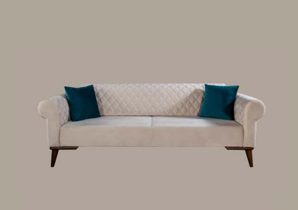 Déi Luxus Sofagarnitur 3+3+1 Sëtz Drësëtzer Sofa Stoff Textil Stil Fauteuil ass ideal fir all déi, déi en eleganten an zäitgenësseschen Stil an hirem Wunnraum sichen. Mat enger imponente Gréisst vun ca. 228 cm Längt, 92 cm Breet an 77 cm Héicht, ass dëse Sofa perfekt fir Familljen oder Gäscht opzeriichten. D'Sëtzhéicht läit bei engem komfortablen 44 cm, an d'Sëtzdéift vu 56 cm bitt genuch Plaz fir sech gemittlech zréckzeschloen. De Sofa ass aus qualitativ héichwäertegem Textil an Holz gemaach, wat en net nëmme robust mécht, mee och fir en natierleche Look suergt. De Stoff ass op eng Manéier entworf, déi net nëmmen ästhetesch ufälleg ass, mee och anescht ka gefierft ginn, wann no Ufro verfügbar.