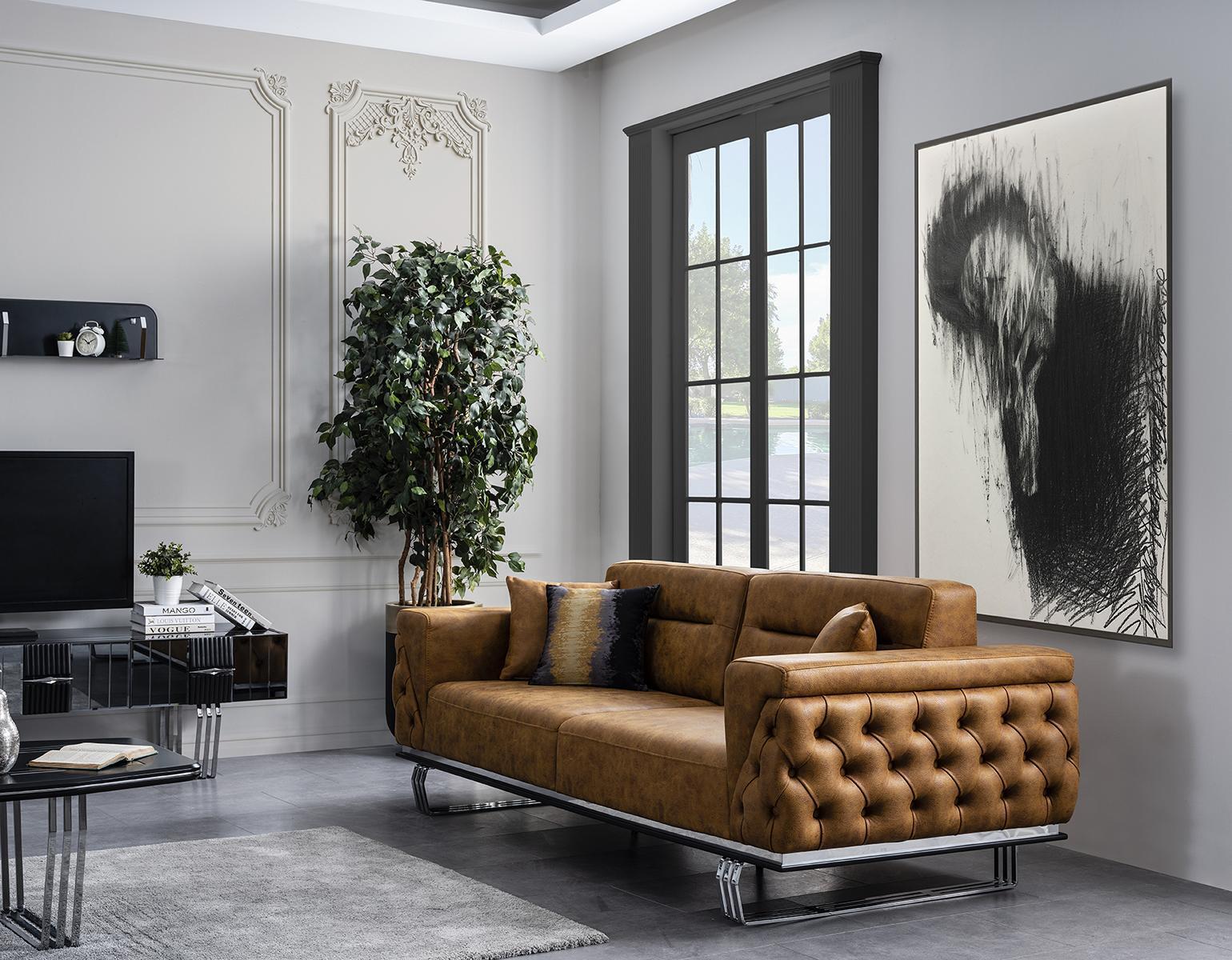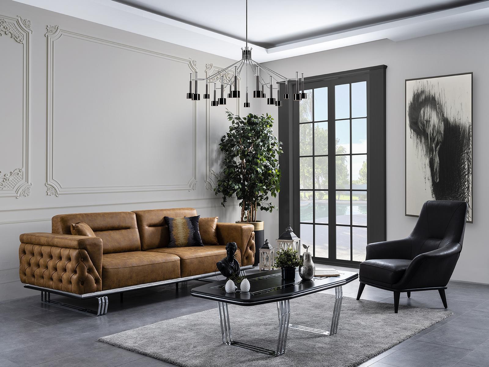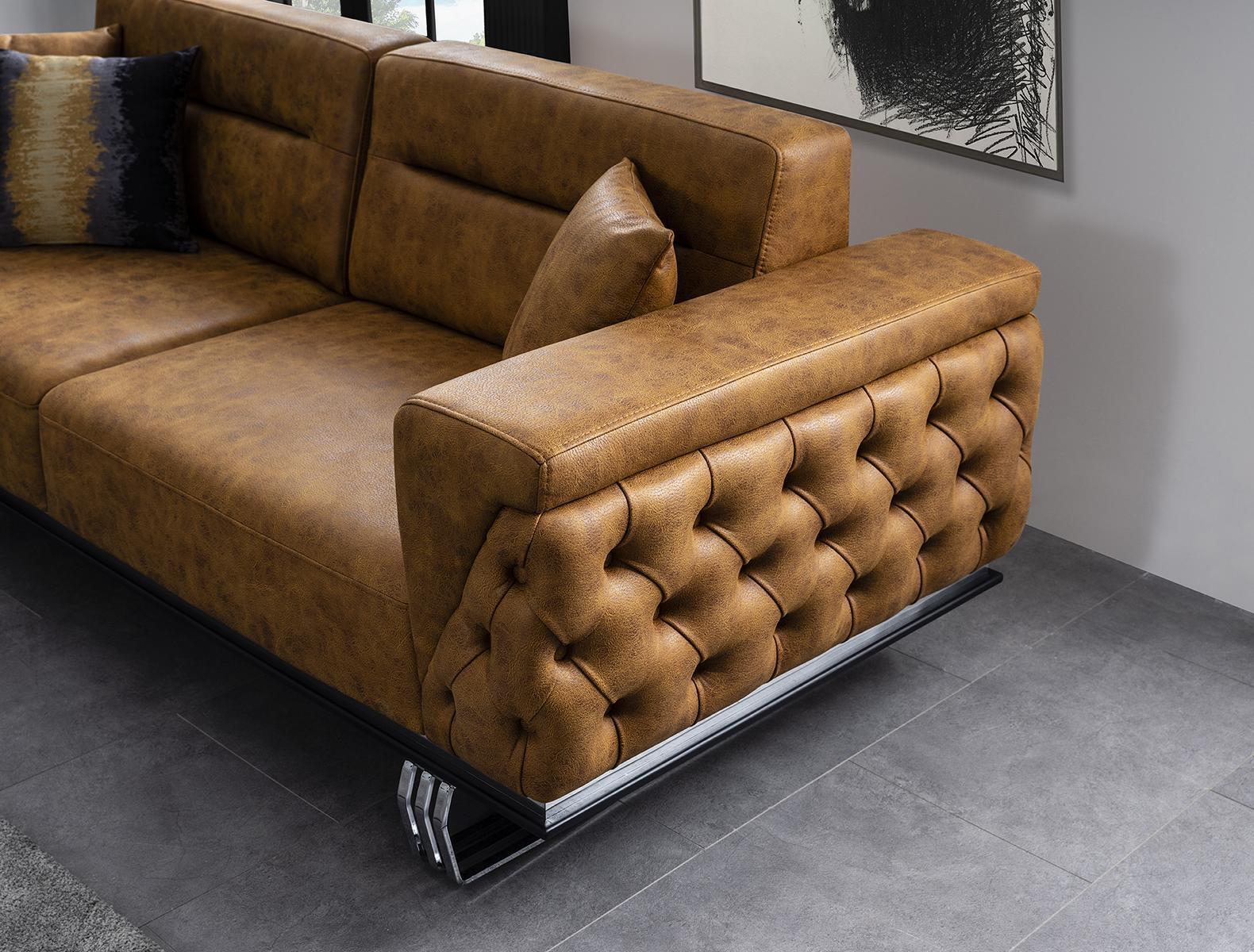 Dëse praktësche Kanapé-Set ass perfekt fir verschidde Geleeënheeten, egal ob Dir Gäscht zu engem Dinner mat Frënn invitéiert oder einfach erelaxen wëllt nom laangen Dag. D'Fotell bitt zousätzlech Sëtzplaz, während de groussen Kanapé genuch Platz fir Famill an Frënn bitt. Dir kënnt déi elegant Braunfaarf auswielen wéi ugebilt oder och aner Faarwen no Uwonsch ufroën, fir datt de Set perfekt un Ären Interieur ugepasst ka ginn. Egal ob an engem moderne Wunngemaach oder engem méi traditionellen Interieur, dëst Set ass e funktionellen a stilvollen Zousaz.