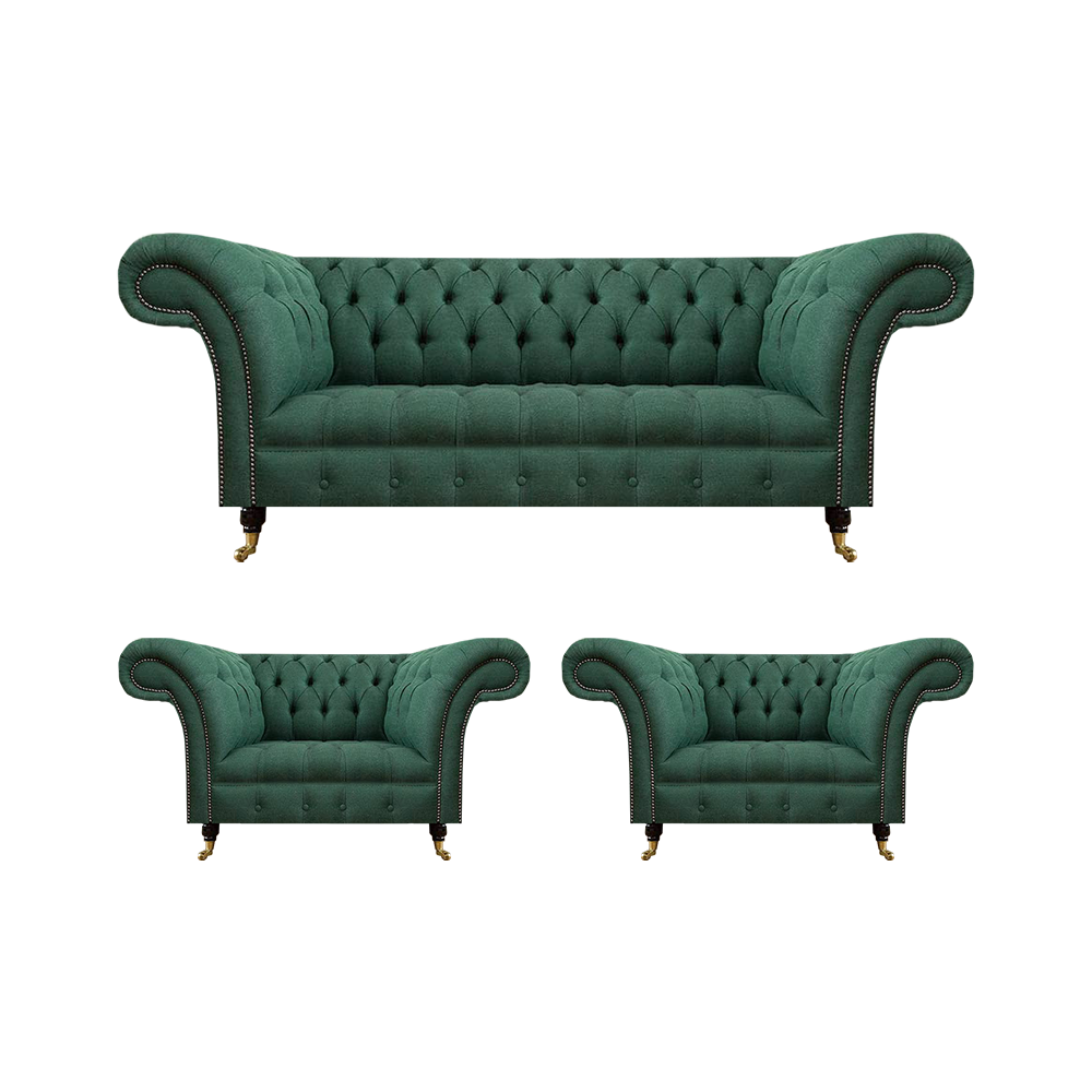 Entdeckt de stilvollen Luxus mat eisem Komplett Set 3-Stéck Wunnzëmmer, inklusiv zwee komfortable Sesselen an engem elegante dräisëtzegen Chesterfield Sofa. Dëse Set ass perfekt fir déi, déi net just Komfort, mee och Stil an hir Wunnzëmmer sichen. Mat enge Moossen vun ca. 220 x 90 x 80 cm fir den Sofa a ca. 130 x 90 x 80 cm fir d'Still, bitt dëse Set genuch Plaz fir Entspanung ouni d'Zëmmer ze iwwerlaaschten. Verfügbar an enger ëmweltfrëndlecher gréng Faarf an aus héichwäertegem Holz mat Textilmaterial, kënnt Dir d'Material an d'Faarf wielen, déi am Beschten zu Ärem Interieur passt. D'Set kënnt mat verschiddene Materialoptiounen, vun Premium Konschtlieder bis Magic Home Fleckenofweisendem Stoff.
