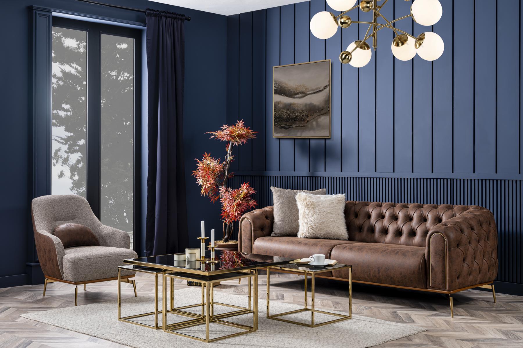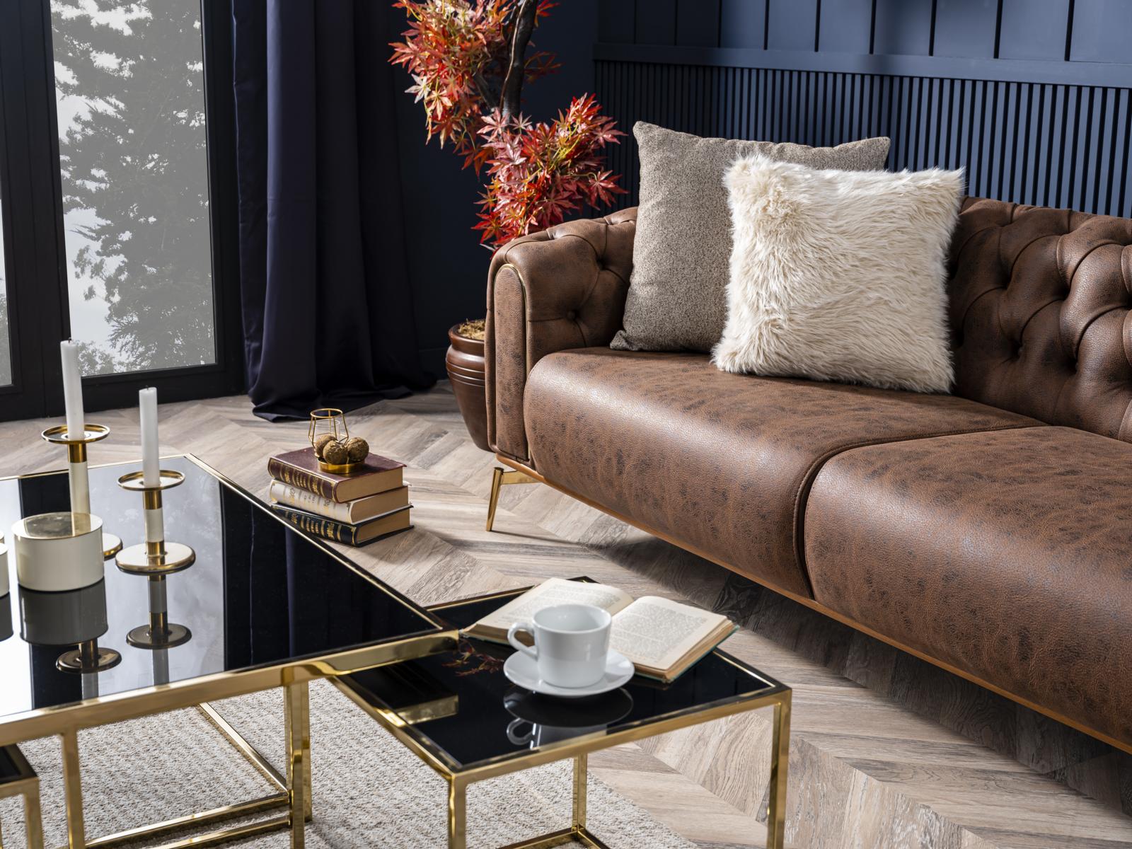Dëse prächtige Chesterfield Sofa ass perfekt fir déi, déi en Touch vu Klassiker an hire Wunnraum brénge wëllen. Ideal fir den Haaptraum vun Ärem Haus oder als exquisite Ergänzung fir Äert Büro oder de Salonsberäich. D'Kombinatioun vun Design an Funktionalitéit mécht et zu enger super Wiel fir béid Alldag an speziell Occasiounen. Et ass net nëmme fir Gesiichter, mee och optimal fir ze loungen, liesen, oder e gemittleche Filmowend mat aneren ze genéissen. Mat dësem stilvollen an draanglosen Sofa verbënnt Dir Komfort mat Eleganz a mécht all Raum zu engem Plaz vu Raffinessegkeet an Entspanung.