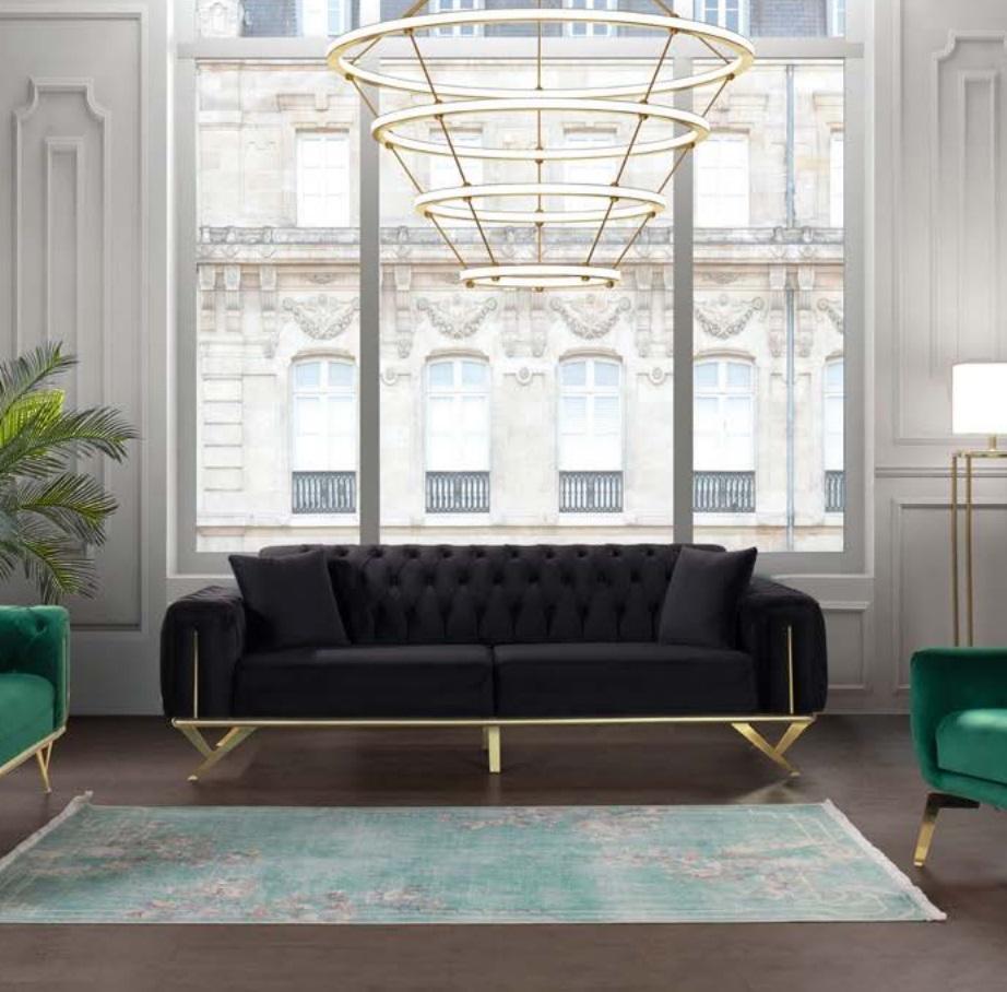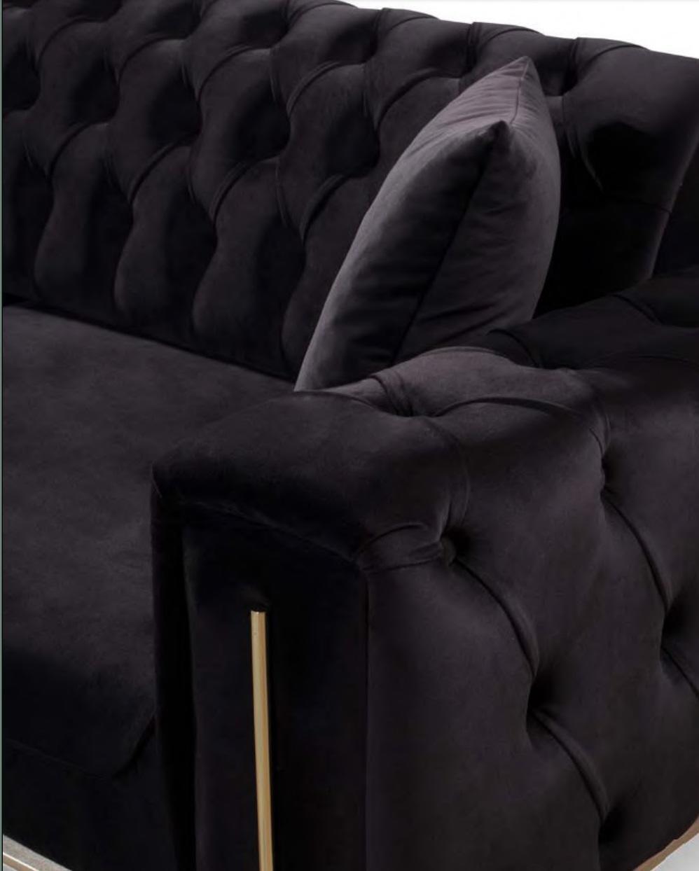 Schwaarz Chesterfield Canapé Drësëtzer Sëtzpolster Sofa Samt Holz