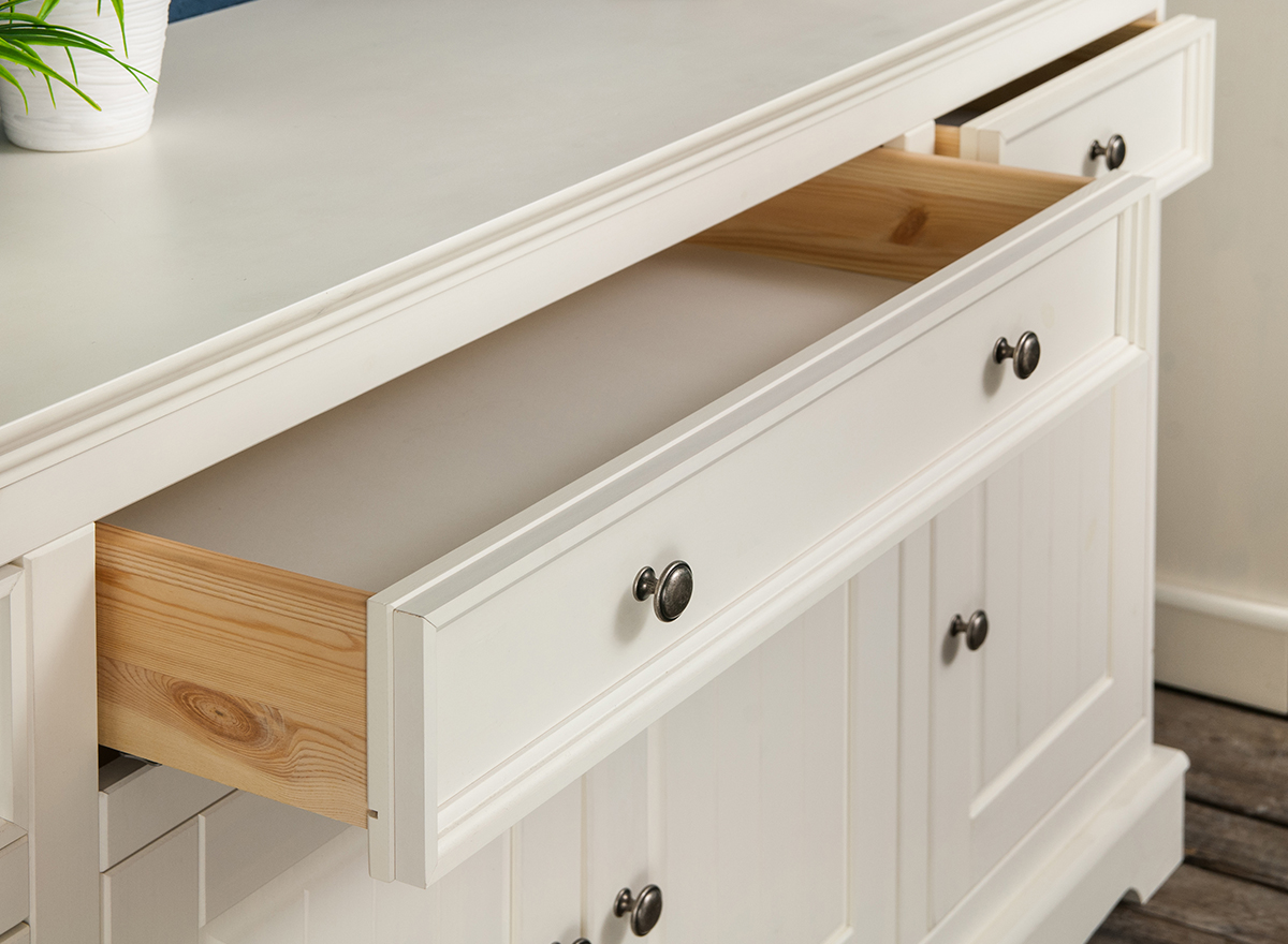 Dank hirem räiche Stauraum kann dës Sideboard als praktesch Anrichte an ärem Iesszëmmer oder als stilvoll Aufbewahrungsléisung am Living genotzt ginn. Mat hiren geschmaachevollen Design an de robuste Materialien, ass dës Kommode net nëmmen ästhetesch schéin, mee och extrem funktional. Setzt se als zentralen Punkt an ärem Raum a kombinéiert se mat aneren natierlechen Dekor Elementer fir e rouegen, vermëttelbaren Look. Egal ob Dir se benotze wëllt fir Geschir, Bicher oder aner perséinlech Artikele vum Bléck ze verstoppen, dëse Schaf erlaabt Iech, Uerdnung a Stil a Perfektioun ze bréngen.