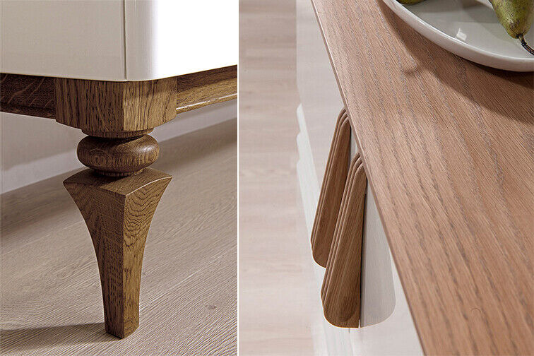 Dës Komoud bitt vill Späicherraum fir richteg Organisatioun an ass idéal fir déi, déi e verstoppte Stauplang virzéien. Déi déif Regaler sinn bequem, fir all méiglech Géigestänn ze verstauen, vu Wäsche bis zu Bicher oder Dekoratiounsartikelen. Déi kombinéiert Uwendung vun héichqualitativen Materialien wéi massiv Holz an MDF erméiglecht et dës Komoud zäitlos an haltbar ze maachen. Stellt Iech dës Komoud als zentrale Punkt an Ärem Stot vir, déi net nëmmen e praktësche Plaz gespäichert, mee och e stilvolle Touch bäifüügt, dank hirer klassescher a raffinéiertem Design. Et ass en ideale Kaf fir déi, déi Wäert op Qualitéit, Funktionalitéit a Styling leeën.