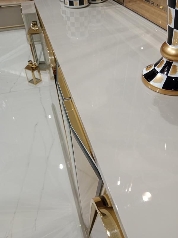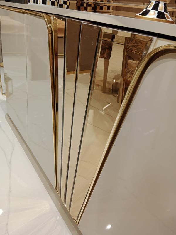 D'Kommode ass mat dräi d'Spigel ausgestatt, déi net nëmme fir praktesch Späicheroptioune sorge kënnen, mee och d'Raumgréisst visuell vergréisseren. Dës modern Erausgae ass ideal fir verschidden Notzungsszenarien – vum Schlofzëmmer bis hin zur Vestibül oder als e stilvollen Akzent am Iesszëmmer. Mat dësem Stéck kënnt Dir ausgewielte Saachen op stilvoller Aart a Weis presentéieren oder einfach ongewenkt Artikelen uerdentlech ewechraumen. Onofhängeg vun der Plaz suergt de Kommode fir e luxuriéisen a modernen Touch an all Ëmfeld.