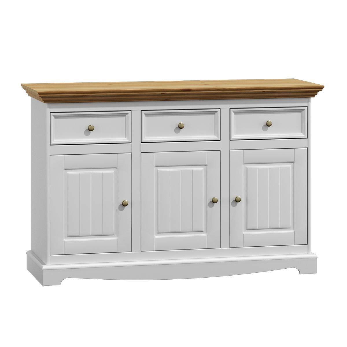 De bannesche Kär vun dëser Kommode besteet aus richtegem Holz, wat hir net nëmme Stabilitéit, mee och eng zeitlos Eleganz gëtt. D'Kommode kann als spektakuläert Säitestéck an ärem Iesszëmmer benotzt ginn, oder als praktesch Anrichte an der Entrée, fir d'Schong oder Accessoiren stilvoll opzebewahren. Mat deene richtegen Accessoiren kann d'Dekoratiounsfläch uewen als Plaz fir Käerzen, Blummen oder aner dekorativ Elementer genotzt ginn, fir d'Atmosphär weider ze verbesseren. Béid säin zäitlosen Design an d'Funktionalitéit mécht d'Kommode zu enger onverzichtbarer Ergänzung fir jidderee, deen en klassesche Landhausstil schätzt.