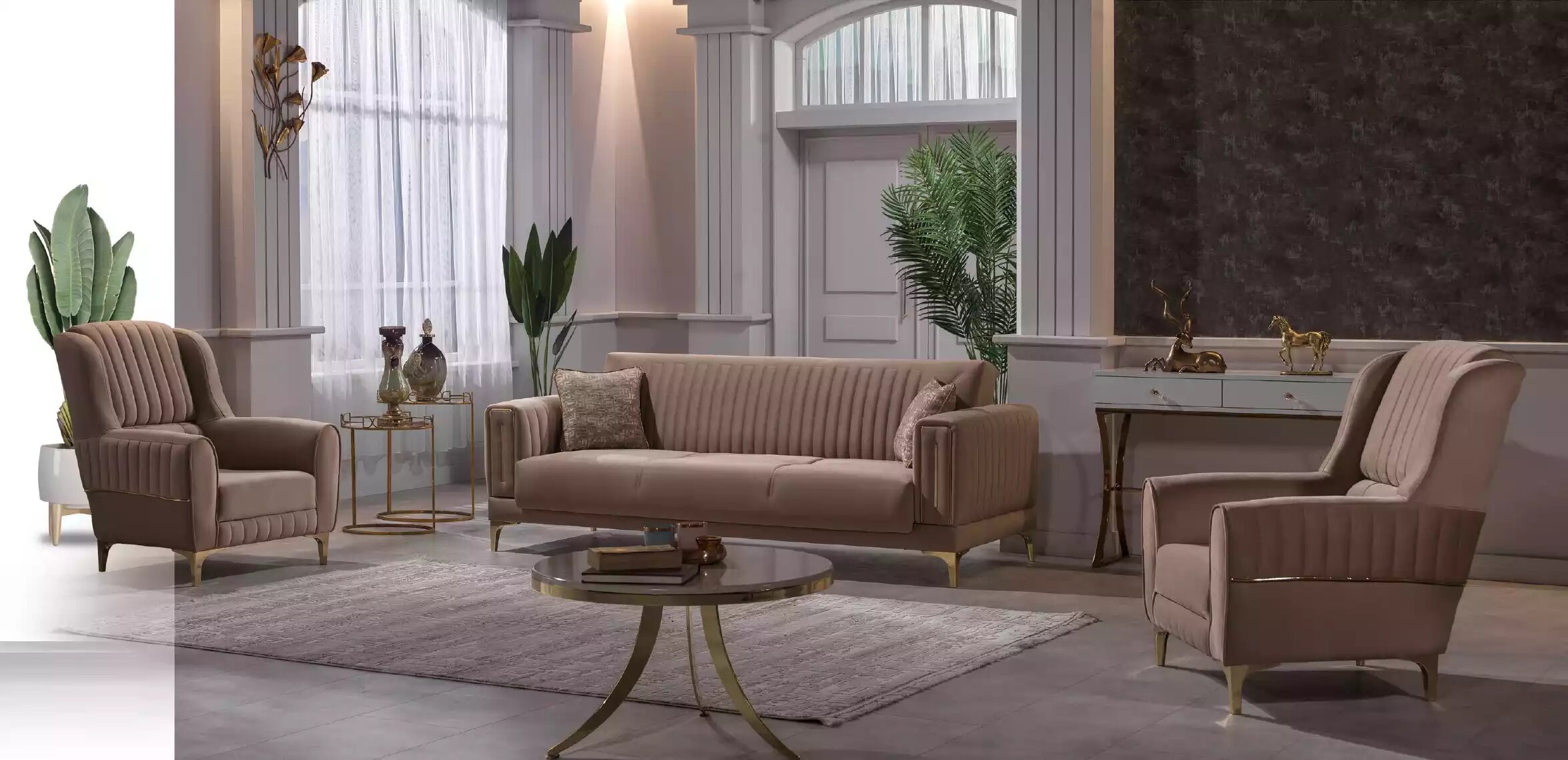 Dës stilvoll Sofa ass net nëmme fir den trendeg Wunnzëmmer, mä passt och perfekt an en elegante Bürosberäich oder eng modern Suite. Seng natierlech brong Faarf, wéi ofgebilt, féiert räichen Ambiente an all Raum, a seng haltbar Materialien maachen et zu enger praktescher Optioun fir déi, déi dacks Gäscht kréien. Egal ob Dir e entspaanende Mëtteg mat enger gutt Liesbuch genéisst oder e Filmowend mat de Léifsten plaangt, dëst Designer Sofa wäert Är Erwartungen iwwertraffen a Komfort a Stilo op en neien Niveau bréngen.