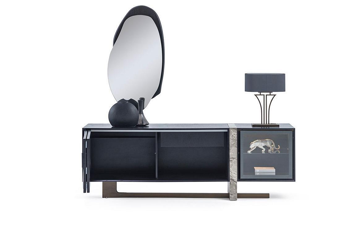 Dank senger flexibeler Uwendungsméiglechkeet kann dëst zweedeelge Set ideal lescht ginn fir Iesszëmmer, Wunnzëmmer oder souguer en ageriichter Atelierraum. D’Sideboard kann einfach Kichegeschir, bestëmmte Sammelstécker oder aner perséinlech Géigestänn verstoppen a presentéieren. Gläichzäiteg wäert de Spigel Licht reflektéieren a Raumgréisst verbesseren fir eng nach méi opfälleg Optik; och beschtens gëeegent fir klenge Raimer. Mat dësem luxuriéisem Set gesitt Dir, wéi praktesch a schéin eenz fir en harmonescht Heem si kann sinn.