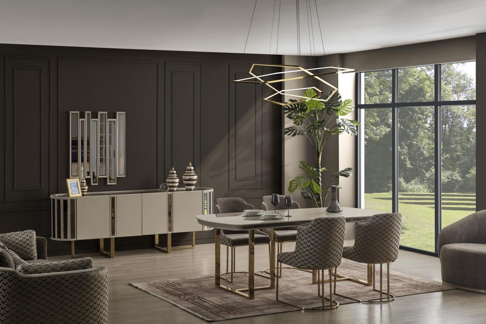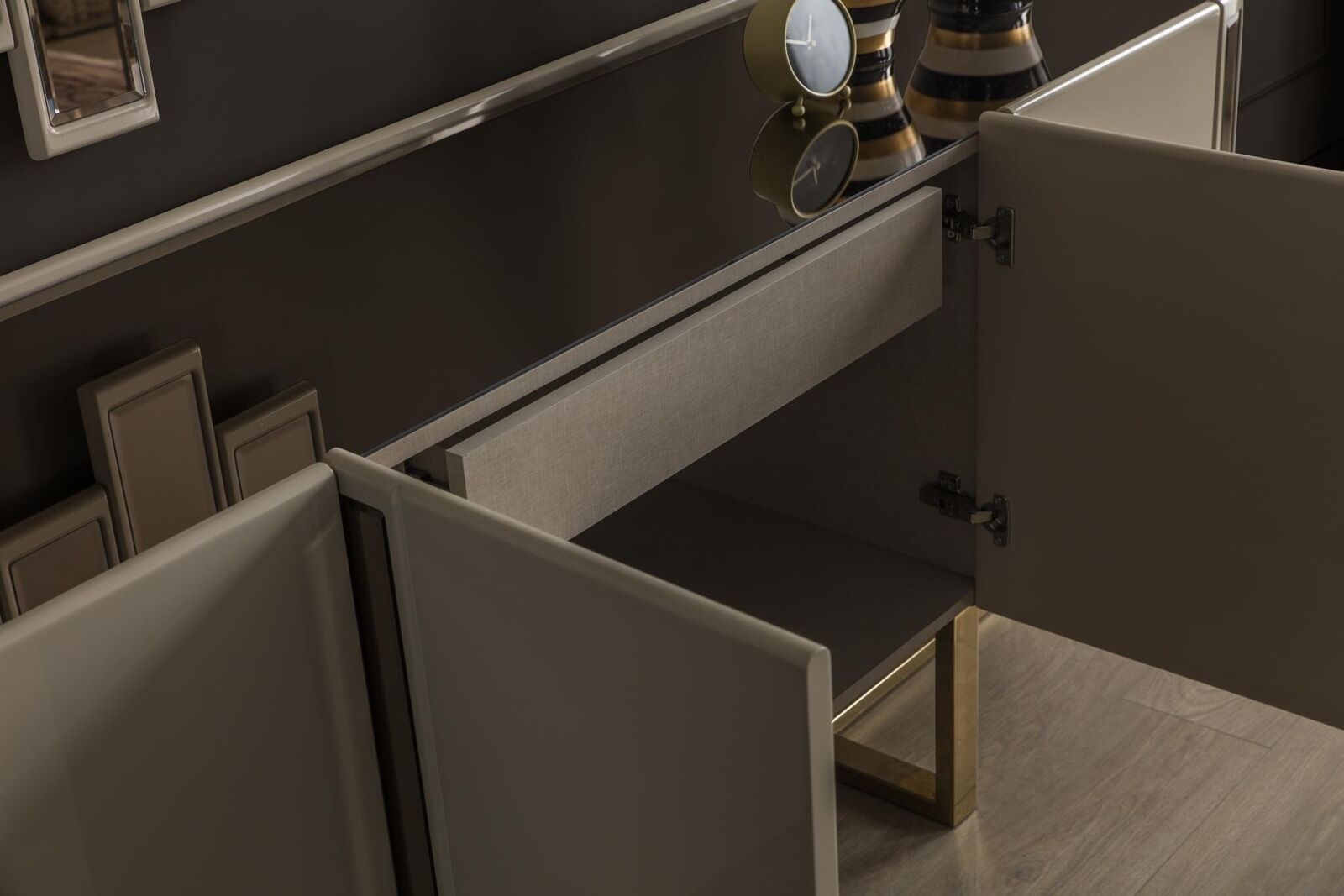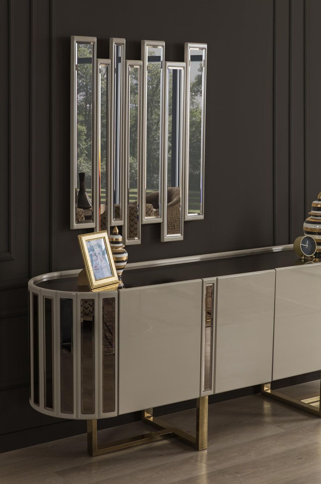 De Spigel, mat senge kompakten Dimensiounen vun ungeféier 73 cm Längt an 106 cm Héicht, ergänzt perfekt d'Ästhetik vum Sideboard. Dës Kombinatioun ass ideal fir en Iess- oder Schlofzëmmer, wou Ästhetik an Nëtzläichkeet d'Hand goe sollen. Stellt Iech vir, wéi dësen modern an luxuriséierenden Miwwel eng harmonesch Ambiance kreéiert, déi béid Gäscht a Bewunner gleäichermassen beandrockt. Dëse Set ass en absolute Must fir jiddereen, deen op der Sich no engem multifunktionalen, ästheteschen a qualitativ héichwäertege Miwwelstéck ass.