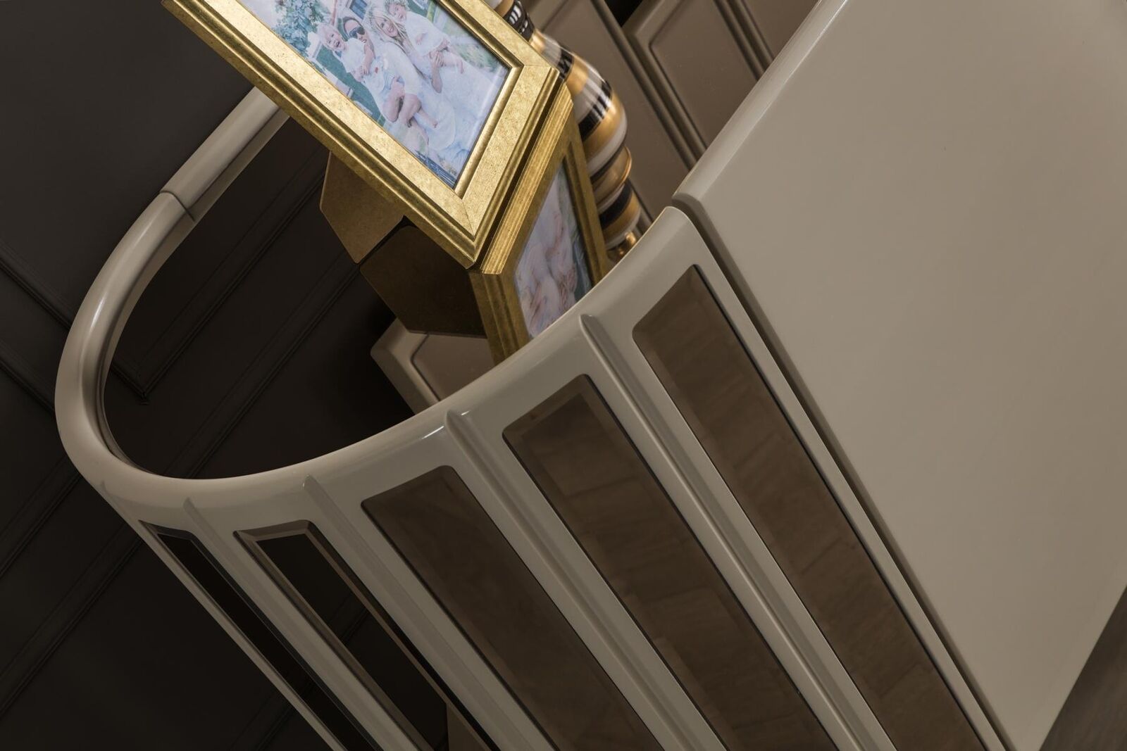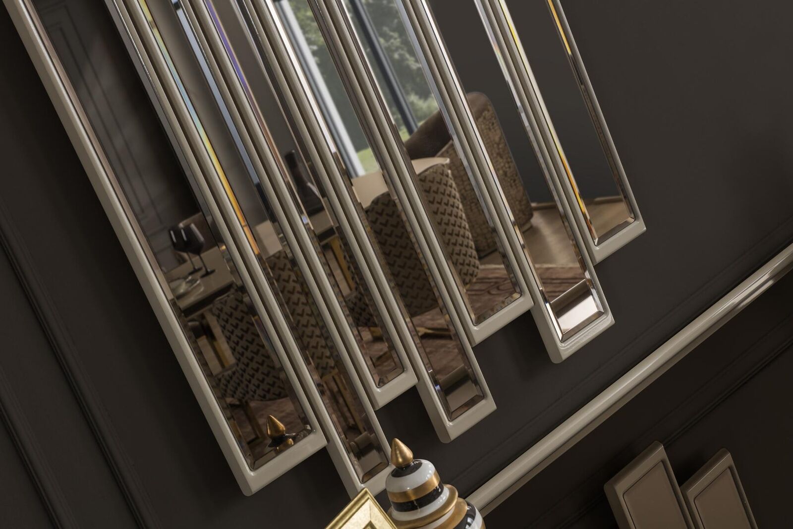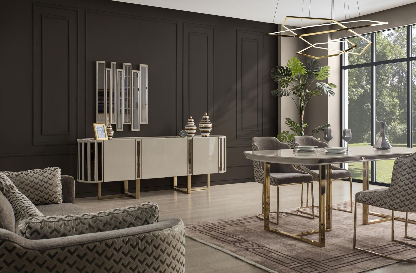 De Spigel, mat senge kompakten Dimensiounen vun ungeféier 73 cm Längt an 106 cm Héicht, ergänzt perfekt d'Ästhetik vum Sideboard. Dës Kombinatioun ass ideal fir en Iess- oder Schlofzëmmer, wou Ästhetik an Nëtzläichkeet d'Hand goe sollen. Stellt Iech vir, wéi dësen modern an luxuriséierenden Miwwel eng harmonesch Ambiance kreéiert, déi béid Gäscht a Bewunner gleäichermassen beandrockt. Dëse Set ass en absolute Must fir jiddereen, deen op der Sich no engem multifunktionalen, ästheteschen a qualitativ héichwäertege Miwwelstéck ass.