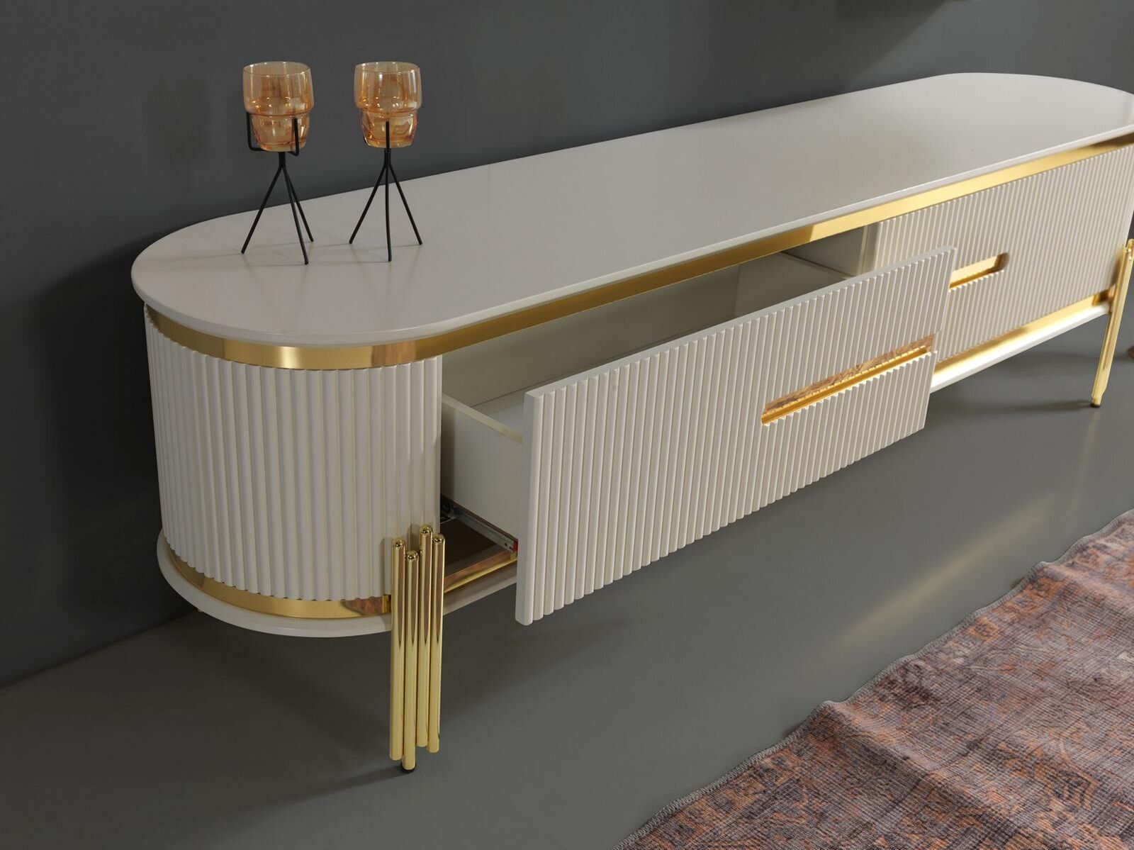 Den 'TV-Stänner RTV Lowboard Wäiss Dësch Holz Modern Wunnzëmmer Sideboard' ass eng stilvoller Ergänzung fir Äert Wunnzëmmer, déi e modernen a chicen Design mat sech bréngt. Mat dimensioune vun ongeféier 208 cm an der Längt, 45 cm an der Breet an enger Héicht vun 50 cm, bitt dëst elegant Möbelstéck genuch Plaz fir Är Elektronik a perséinlech Saachen. Seng wäiss Faarf ass minimalistesch an zäitlos, perfekt fir e proppert an ofgeronntent Erscheinungsbild. D'Material aus qualitativ héichwäertegem Holz garantéiert net nëmmen Zouverlässegkeet an Haltbarkeet, mee och eng lieweg und natierlech Notzecht.