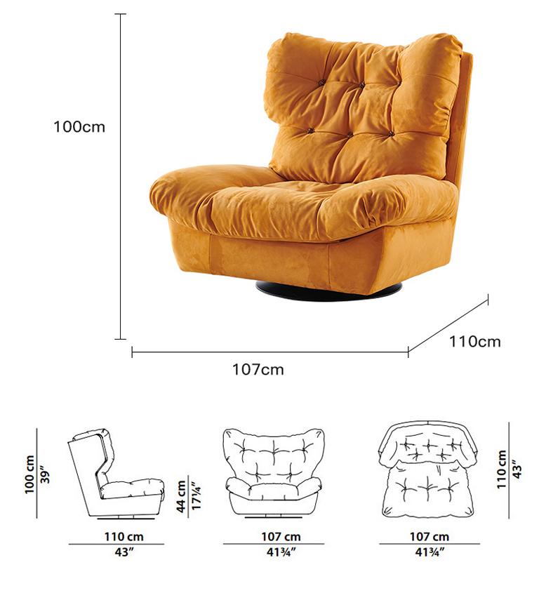 Dëse Relax-Sessel ass ideal fir déi, déi Entspanung op engem héijen Niveau sichen, egal ob Dir e klenge Power Nap wëllt maachen oder Är Lieblingsfilmer kuckt. Mat enger Sëtz Héicht vun ca. 4.4 cm an enger Sëtzdéift vu ca. 5.4 cm, gëtt et de perfekte Support fir e laangen a gemittlechen Dag. D'Notzung vun italieneschem Rëndfleder an der echt Holzstruktur suergen net nëmme fir maximalen Komfort, mee och fir e luxuriéisen a raffinéiert Look. Den Dréiensa Mechanismus erlaabt Iech de Sessel einfach a Betrag haaptsächlech a verschiddene Richtungen, wat et perfekt mécht fir e gemittleche Kënntex oder als Highlight an Ärem Wunnzëmmer.