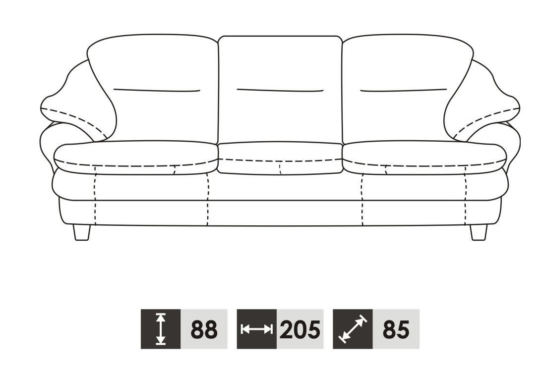 Entdeckt déi luxuriéis Kino Couch Dräisëtzer Couch 3 Sëtzer Polstersofa Lieder Sofas Couchen, déi eng perfekt Mëschung aus Stil, Komfort a Funktionalitéit ubitt. Mat enger Längt vun ongeféier 205 cm, Héicht vun 88 cm an Déift vun 85 cm, ass dës Sofa ideal fir all wunnt Szenarioen. D'Sofa ass a verschiddene Faarwen verfügbar, sou datt Dir Är perséinlech Preferenzen einfach afloe loosse kënnt. D'Materialwahl ass extensiv, mat Optiounen wéi Premium Kënschtleeder an Textilstoff ouni Zousatzkäschten, oder fir déi, déi e méi exklusive Touch sichen, ass Premium Echtleder an Magic Home Fleckenofweisend Stoff verfügbar, allenzwee géint e klengen Oppräis.