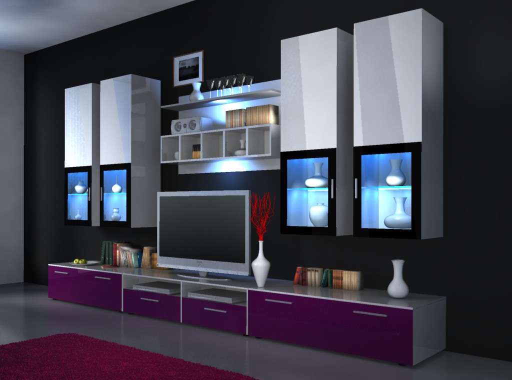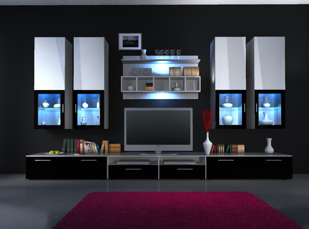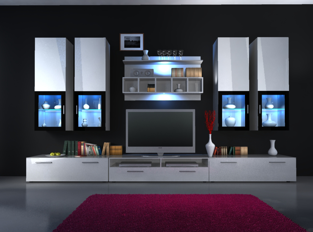 Wunnwand Ausbaumauer Schiefwand Héichglanz "Faarfwahl" LED Beliichtung Regal nei