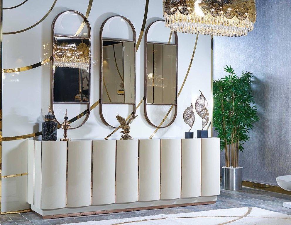 Wunnzëmmer Kommode wäiss Spigel Material Holz mat Metall Stil Modern