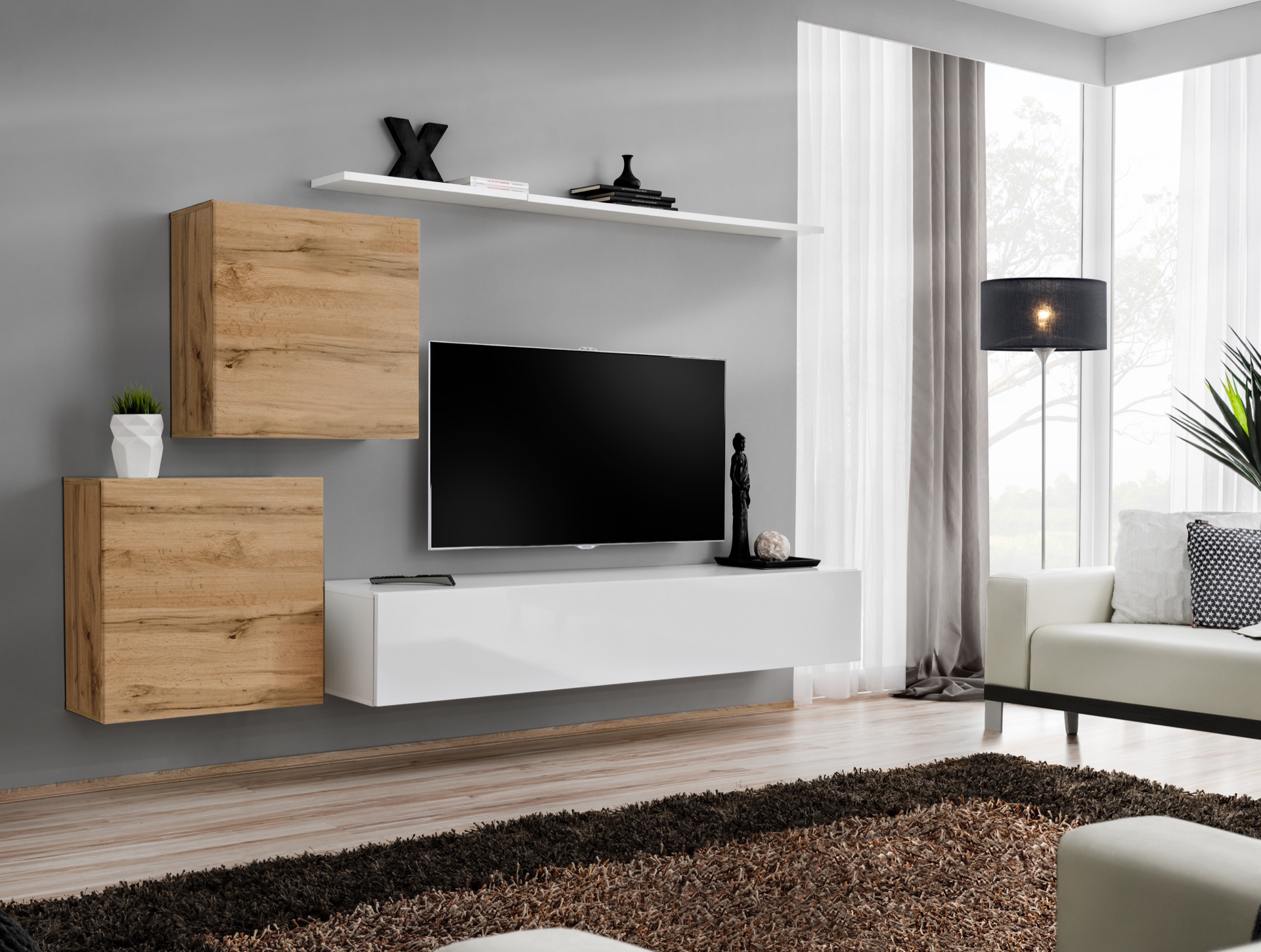 Dëse Set ass perfekt fir jiddereen, deen e modernt an funktionellt Wunnzëmmer sichen. Mat de villen Elementer kënne vill verschidde Stiler a Konfiguratioune geschaf ginn, ob fir Iech selwer ze genéissen oder fir Gäscht ze impressionéieren. D'***Wunnwand*** an de ***TV Ständer*** sinn ideal fir Är Multimedia Sécherungen, wärend déi zweet ***Wandschaf*** optimal ass fir Wäsch oder Datensammlung. D'***Wandregal*** ka fir klenger Dekorationen benotzt ginn oder als funktionell Ubannung fir perséinlech Artikelen déngen. Den haltbare Materialien vum **Holz** suerge fir laang Liewensdauer an Robustheet, wärend dat attraktivt Design hire Raum raffinéiert ervirhieft. Genéisst en harmonescht an organiséiert Wunnzëmmer mat dësem stilvollen a prakteschen Set.