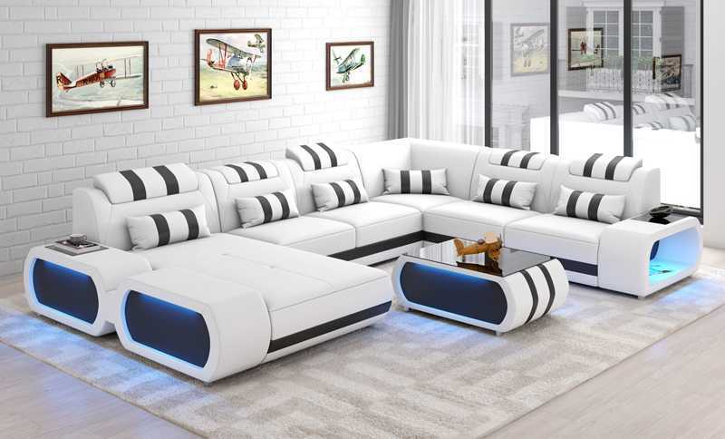 D'Flexibilitéit vun dësem Sofa an der U-Form erlaabt Iech Är Wunnraum optimiséieren a perséinlech Akzent ze setzen. Egal ob Dir e Plaz fir Entspanung, Liesmomenter oder fir social Evenementer braucht, dëst grousst Ecksofa entsprécht all Äre Besoinen. Et ass ideal fir kleng Familljeversammlung oder méi grouss Gesellschaften, well et genuch Sëtzplaz bitt a variéiert an Ärem Raum positionéiert kënne ginn. An déi divers Uewerflächenoptiounen, wéi z.B. Premium Liederfaserstoff oder Premium Textilstoff, erlaben Iech zousätzlech d'Ästhetik an den Komfort un Är spezifesch Virléiften upassen. Dëst Sofa ass eng Investitioun an Stil an Komfort, déi dauerhaft Wäert a Prestige an Äert Wunnzëmmer bréngt.