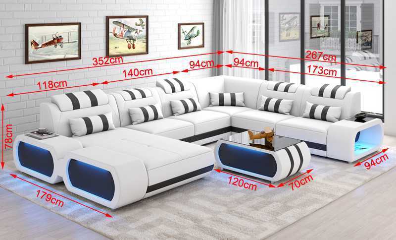 Dat Modern XXL Sofa U-Form Grousst Ecksofa Liederzofa ass eng exklusive Stéck fir Äert Wunnzëmmer, dat Komfort a modernem Design perfekt kombinéiert. Mat enger Länge vun ca. 352 cm, enger hënneschter Längt vun ca. 267 cm an enger zweeter Säitlängt vun ca. 179 cm, bitt et genuch Plaz fir d'ganzt Famill oder Gäscht. D'Héicht vun ca. 78 cm an Déift vun ca. 94 cm garantéieren eng gemittlech Sëtzpositioun. Dir kënnt Iech fir eng Faarf no Ärer Preferenz entscheeden, well d'Sofa a verschiddene Faarwen verfügbar ass, déi Dir ënner dem Reiter "Faarwen" ka fanne. Wielt aus de verschiddene Materialoptiounen wéi Premium Konschtlieder ouni Zousazkäschten, oder, fir en opulent Touch, entscheed Iech fir Premium Echtleder mat engem Zousazkäschten.