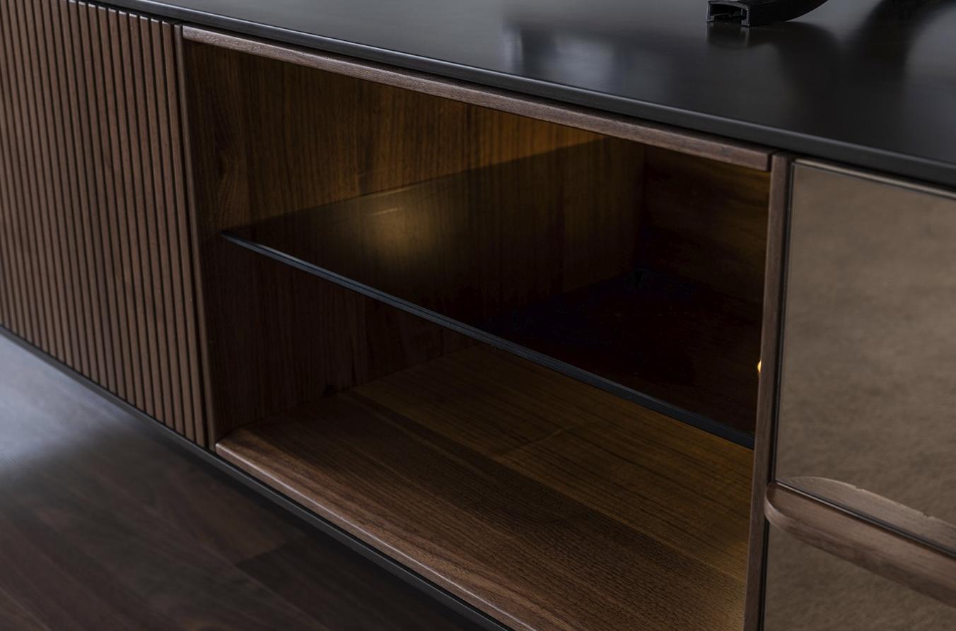 Zousätzlech zu sengen Haaptfunktiounen huet den 'rtv Lowboard' och Regaler mat enger Längt vun ongeféier 100 cm an enger Héicht vun 92 cm, déi ideal sinn fir Bicher, Dekoratiounsartikelen oder aner perséinlech Géigestänn ze plenéieren. Duerch säin multifunktionale Design kann dëst Miwwelstéck als Säitendësch fir eege Pläng oder als Regal an aner Raim an Ärem Haus benotzt ginn. D'Linn, déi seng modern Ästhetik ënnersträicht, a säi geräumegen Design maache dëst Lowboard perfekt fir déi, déi Schéinheet a Funktionalitéit kombinéieren wëllen.