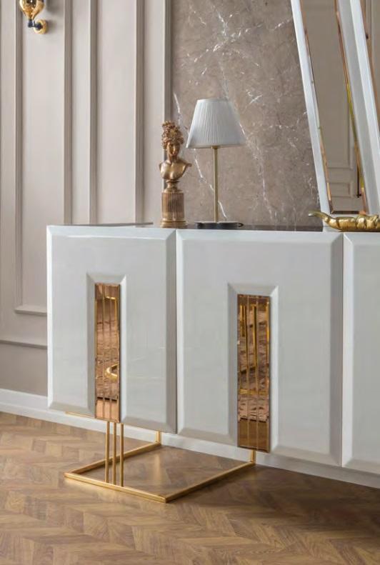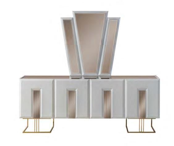 Dës schlank a funktionell Anrichte ass net nëmme stilvoll, mee och extrem praktesch fir all Iesszëmmer a Wunnzëmmer. Mat senger robusten Konstruktioun aus héichwäertegem Holz an Edelstahl, ass si ideal fir d'Lagerung vun Iessen an aner wichteg Accessoiren. Dëse Miwwelstéck, mat sengem raffinéiertem Look, kann och als zentral Punkt an engem Büro oder enger Sal treinéiert ginn, wat e Gefill vu Luxe a Raffinesse géint jede Raum eréischt. Egal ob fir offiziell Reuniounen oder entspaant Famillendinner, dës Anrichte gëtt Kraaft an Eleganz an all Ëmfeld.
