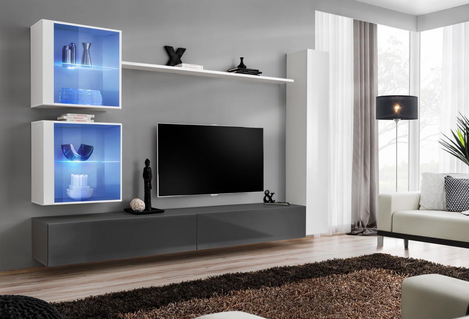 Dank senger raffinéiert Struktur an Designkapazitéit ass dëse Set perfekt fir déi, déi praktesch Funktiounen a schéint Design schätzen. De Wandregal, mat senger décker vun 1.8 cm, ass ideal fir Bicher, Konschtwierker oder kleng Planzen. D'Wandschäifercher bidden eng optimal Léisung fir ewechzemaachen Saachen an de Besoinen diszipliniert am Raum ze halen. De wäisse Faarftoun liwwert eng helleg an offe Raum-gefill, dat ideal ass fir en modernen Lifestyle. Ob Dir een grousse Fernseh oder e puer perséinlech Erauszeigungen erakensko sin, den 'Wäiss Wunnwand Wunnzëmmer Set' ass e perfekten Partner fir e stilvollen an organiséiert Heem-Design.